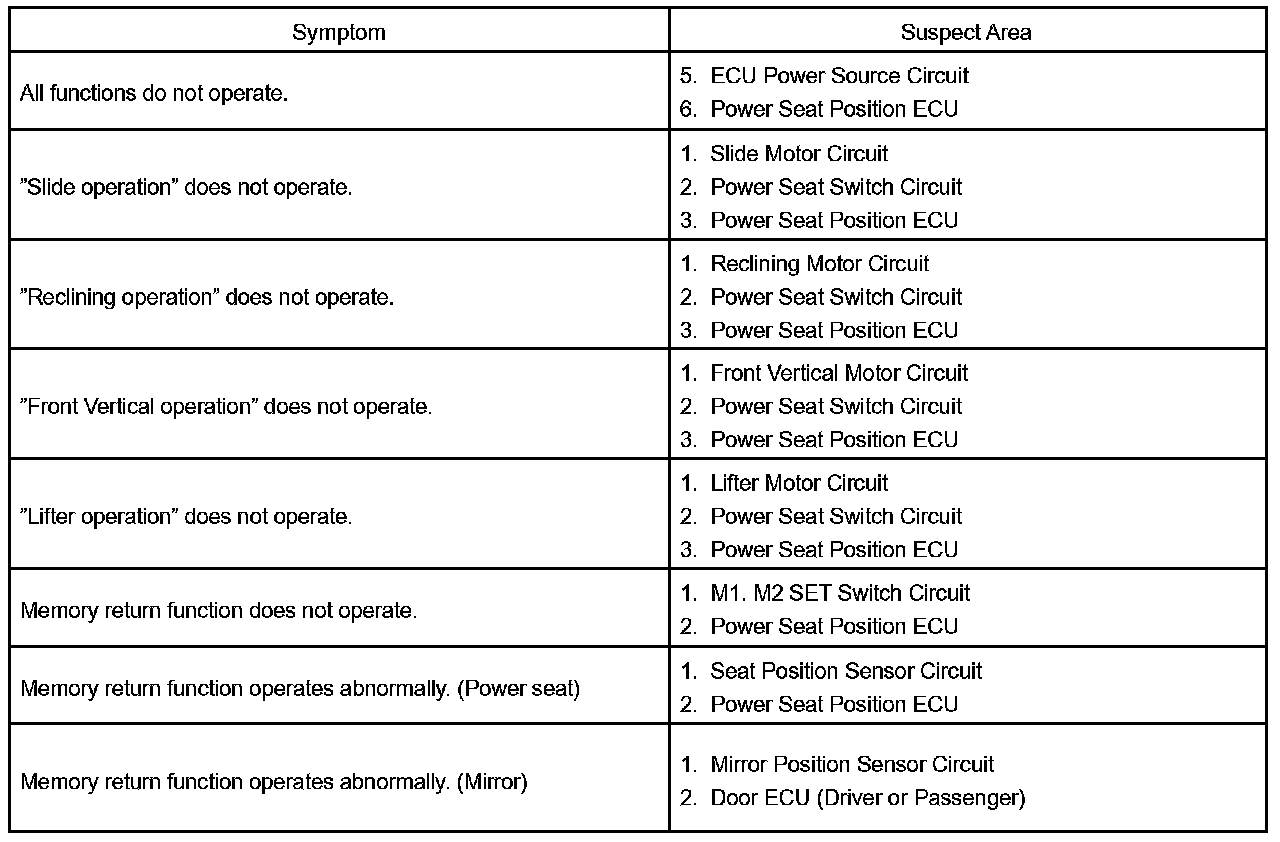 Problem Symptoms Table - Power Seat Control System: