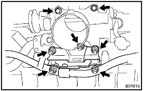 i. Disconnect the 2 water bypass hoses from the throttle body, and remove the throttle body.