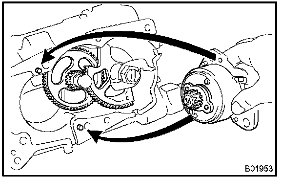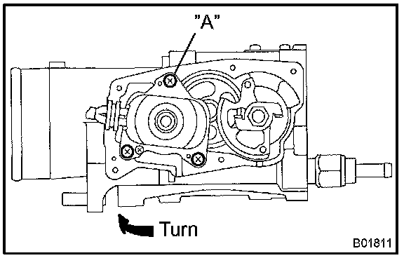 3. Rotate the motor to the direction marked with an arrow and temporarily install the set screw "A" under the condition that there is no wobbles in the motor and the positioning pin.