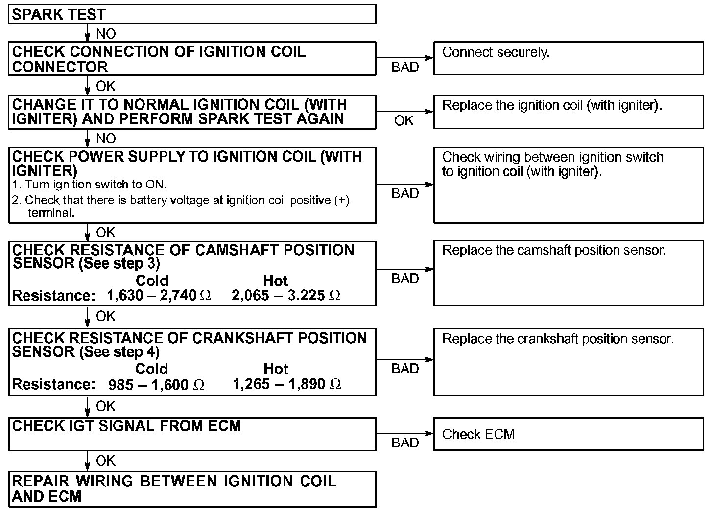 If the resistance is not as specified, replace the ignition coil.