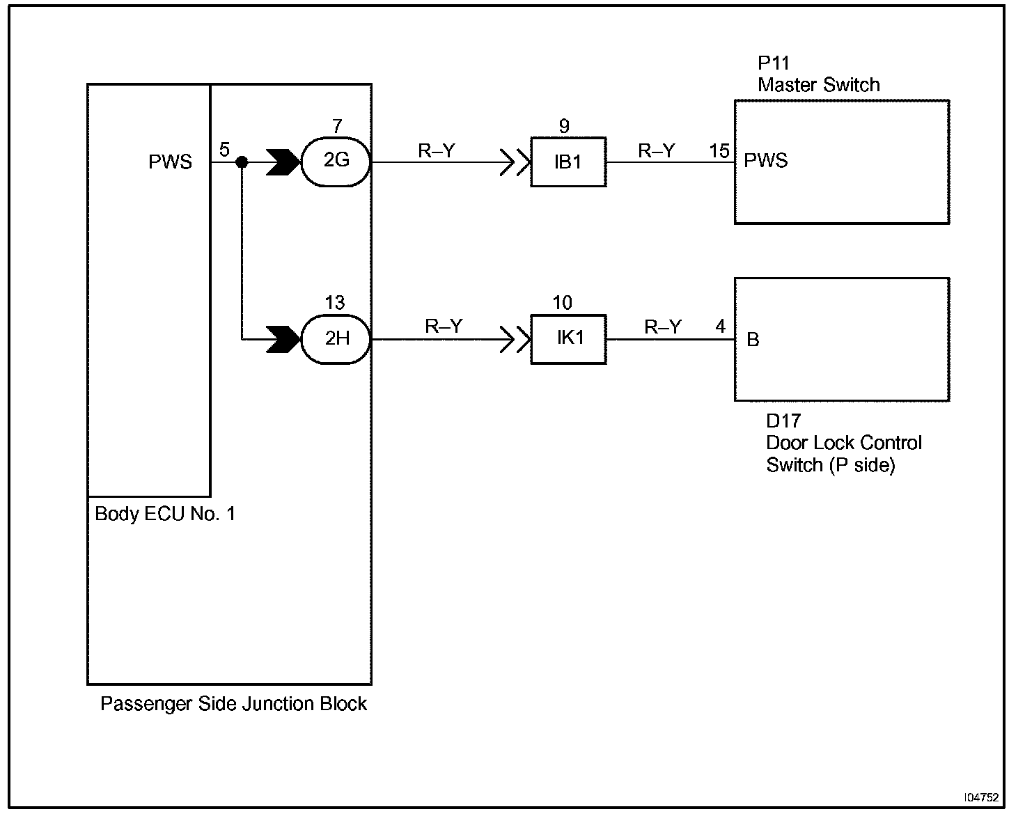 This circuit is the power source of the master switch for the driver's door and the door lock switch for the passenger's doors.