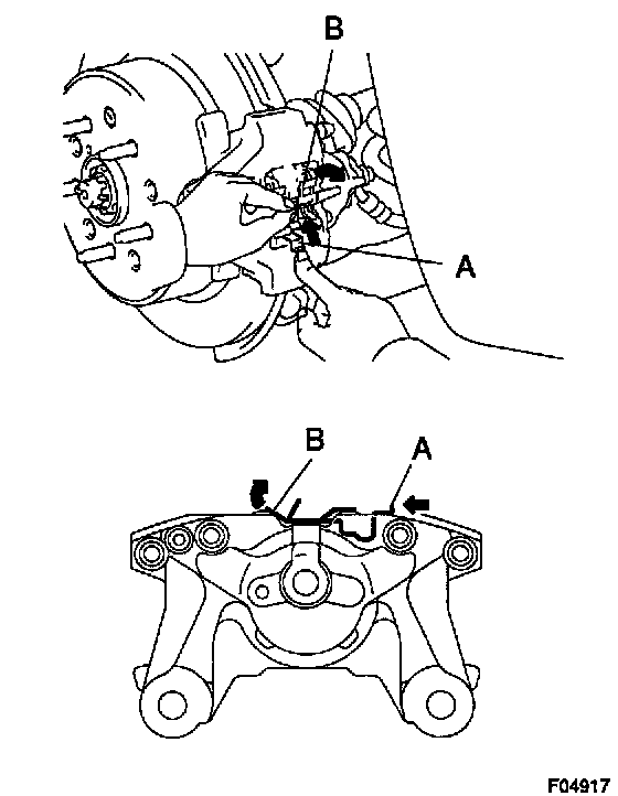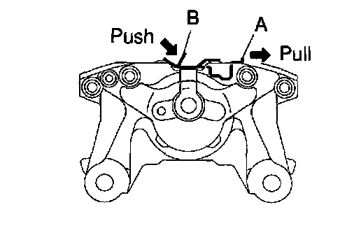 c. Push in the "B" portion with hand, pull the "A" portion and latch the anti-squeal spring to brake caliper.