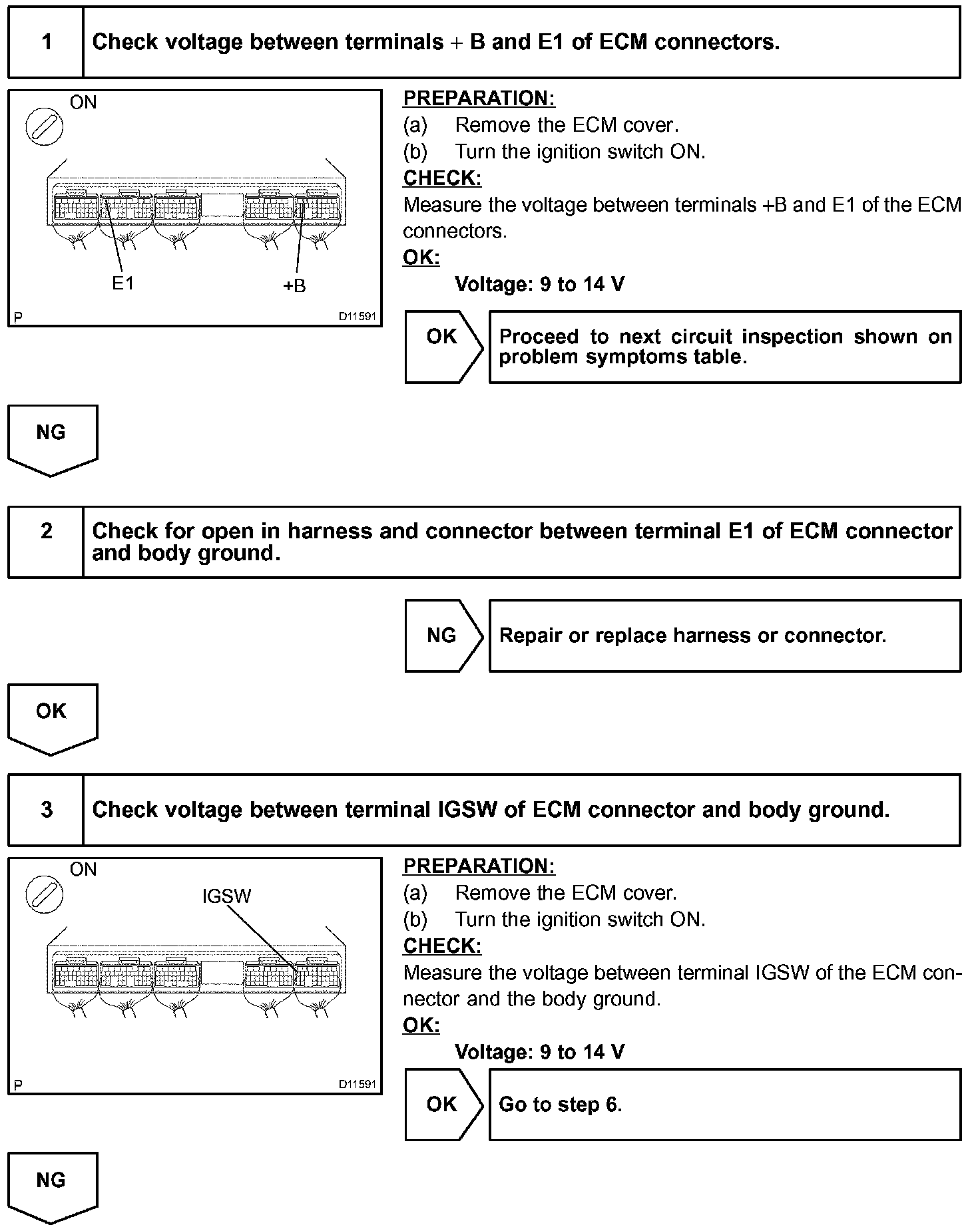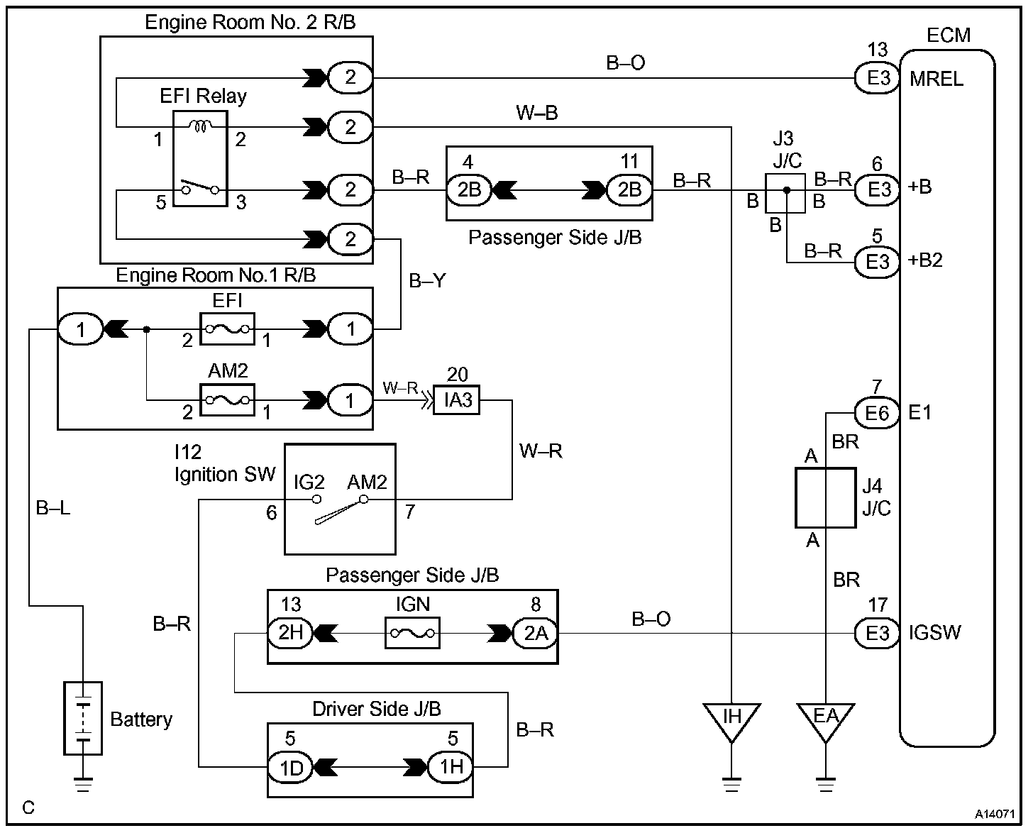 This signal causes current to flow to the coil, closing the contacts of the EFI main relay and supplying power to terminals +B and B2 of the ECM.