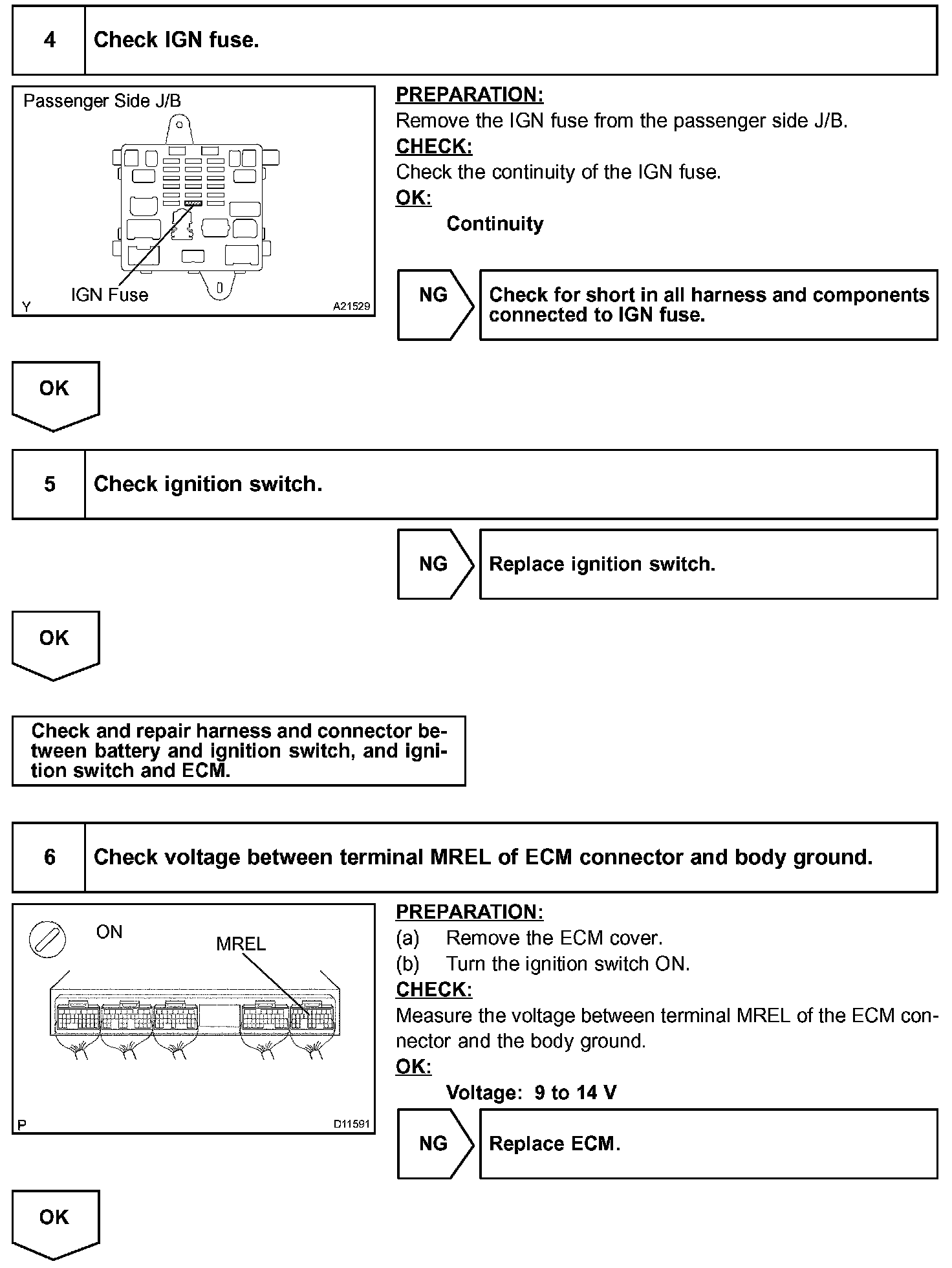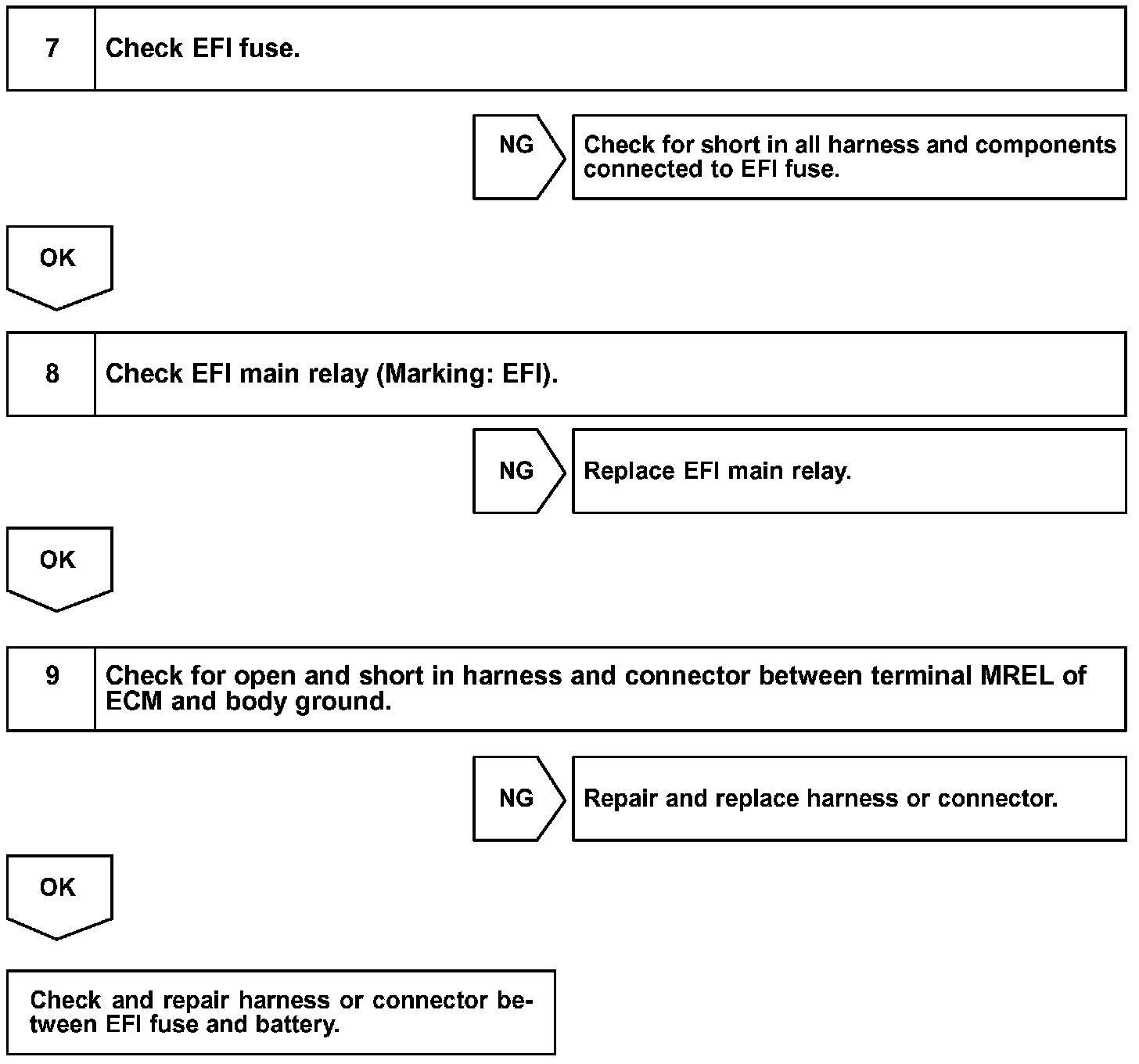 When the ignition switch is turned ON, battery positive voltage is applied to terminal IGSW of the ECM and the EFI main relay (Marking: EFI) control circuit in the ECM sends a signal to terminal MREL of the ECM, switching on the EFI main relay.