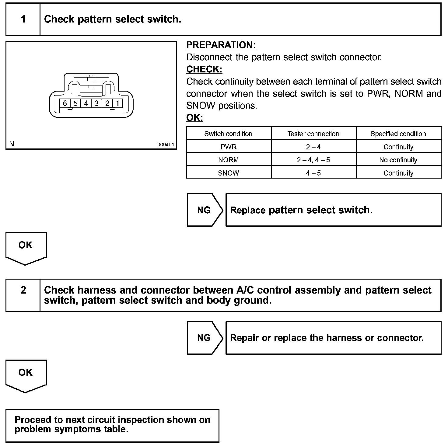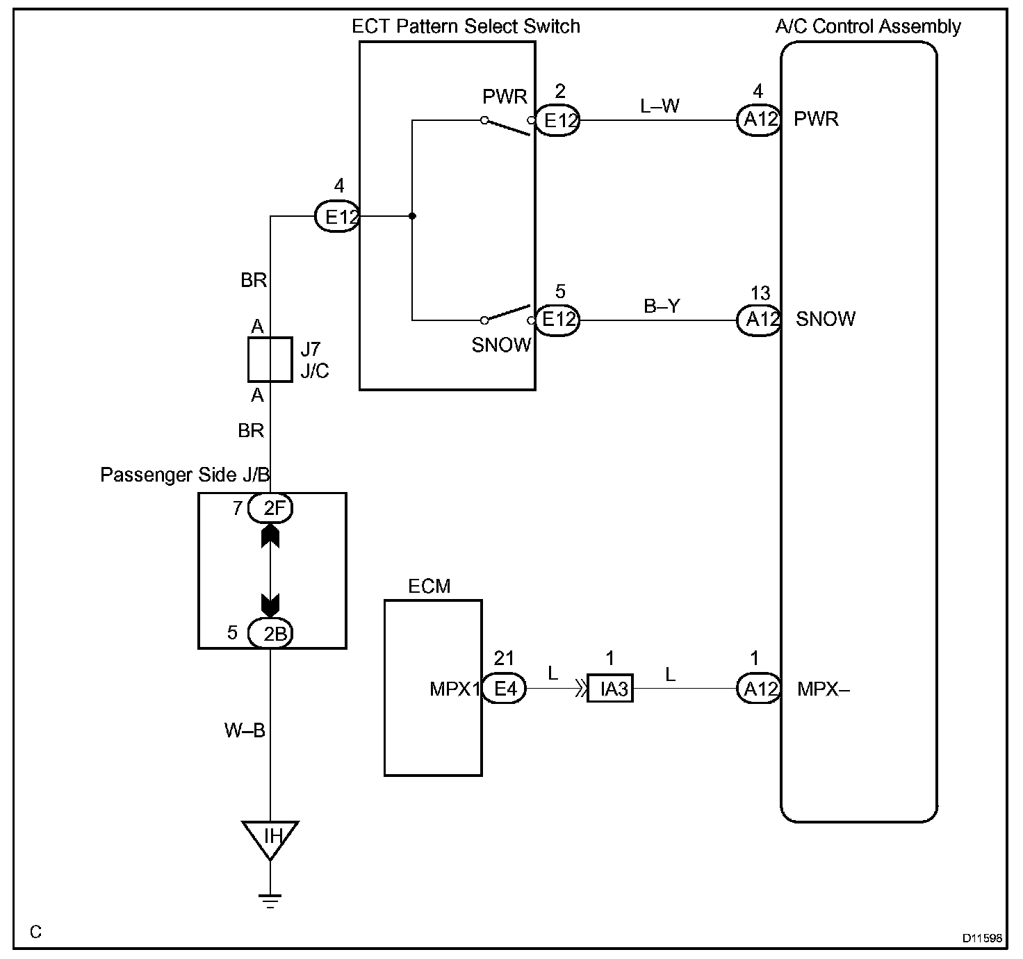 The ECM memory contains the shift programs for the NORMAL, POWER and SNOW patterns, 2 position, L position and the lock-up patterns. By following the programs corresponding to the signals from the pattern select switch, the park/neutral position and other various sensors, the ECM switches the solenoid valves ON and OFF, and controls the transmission gear change and the lock-up clutch operation.