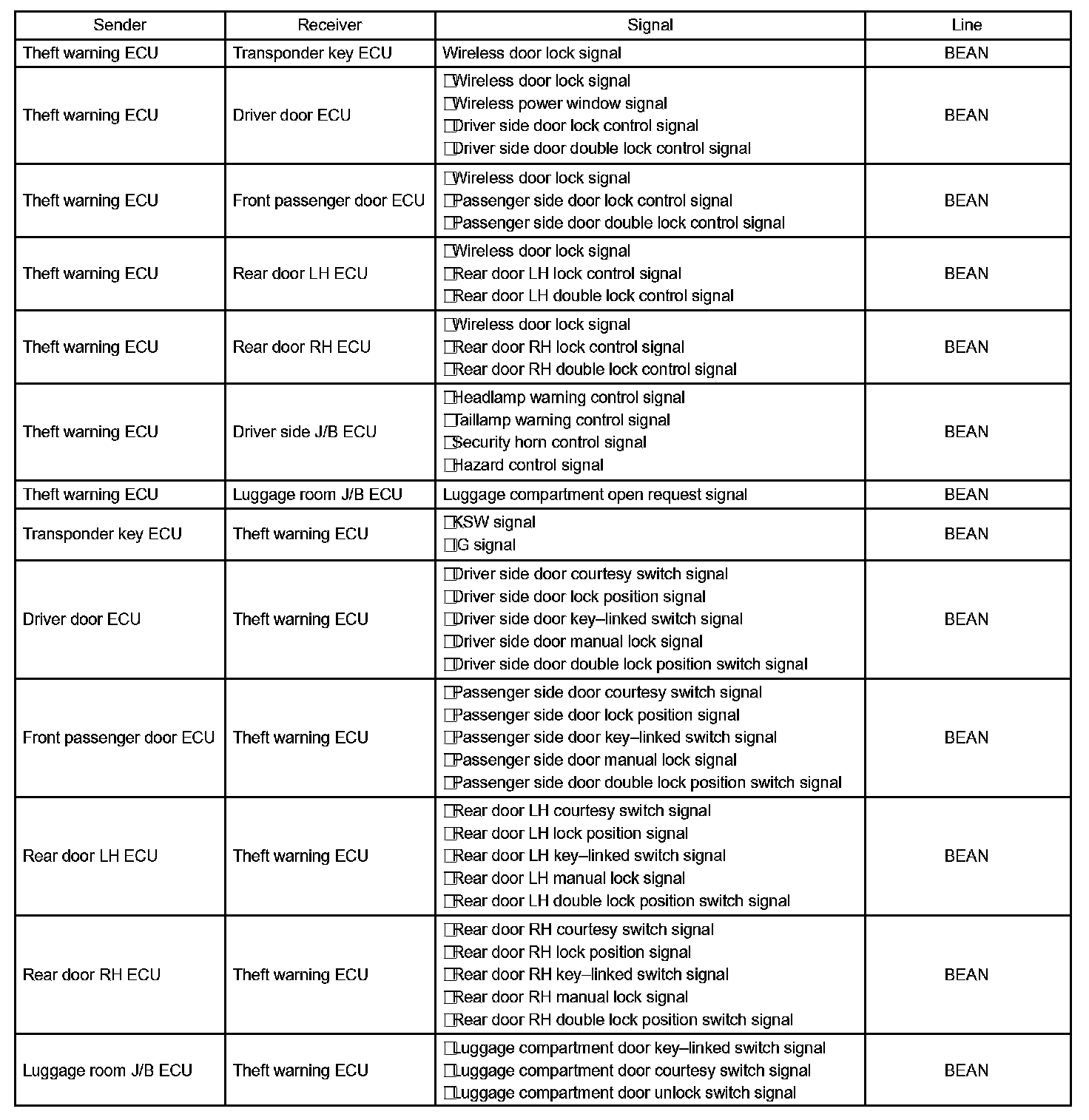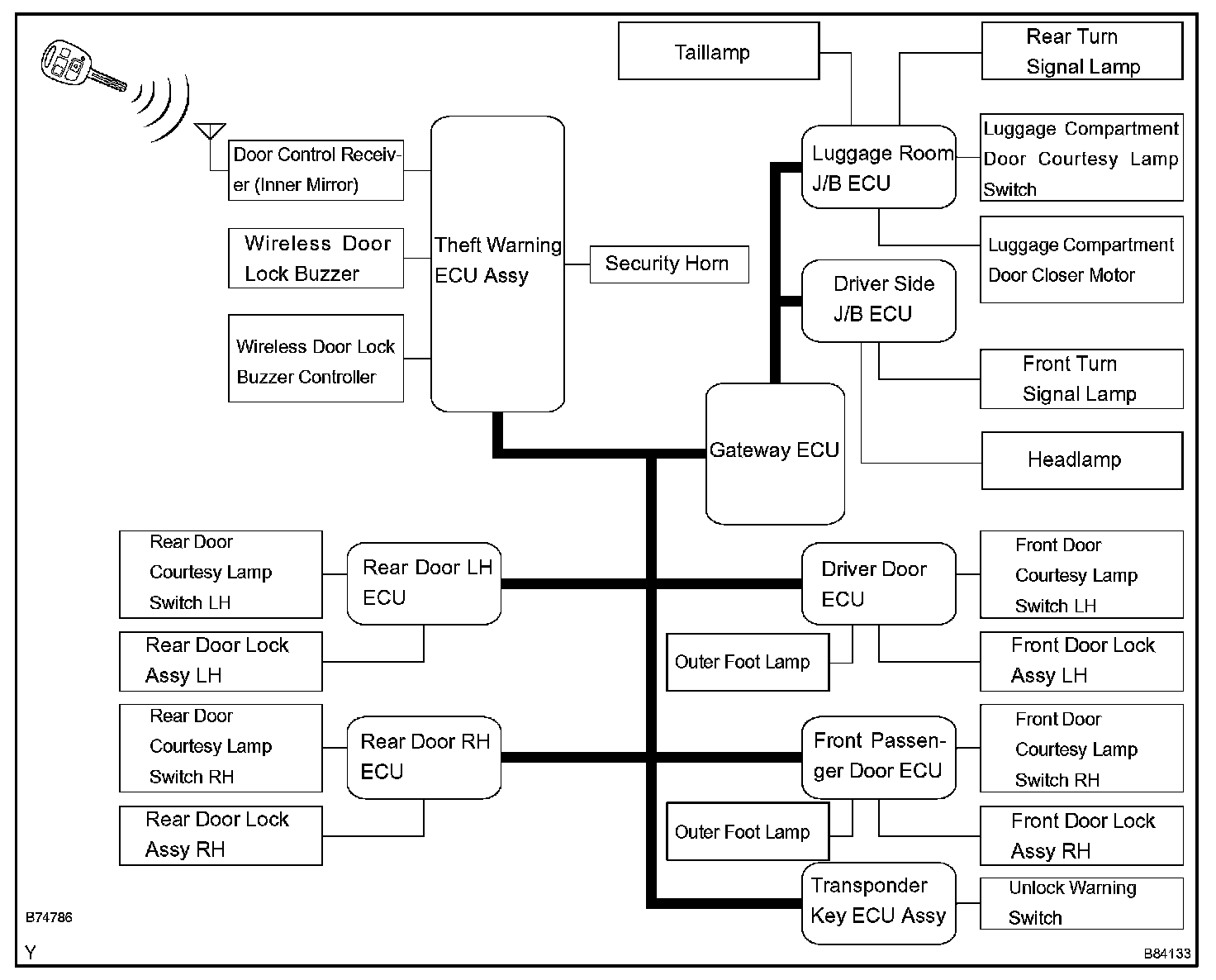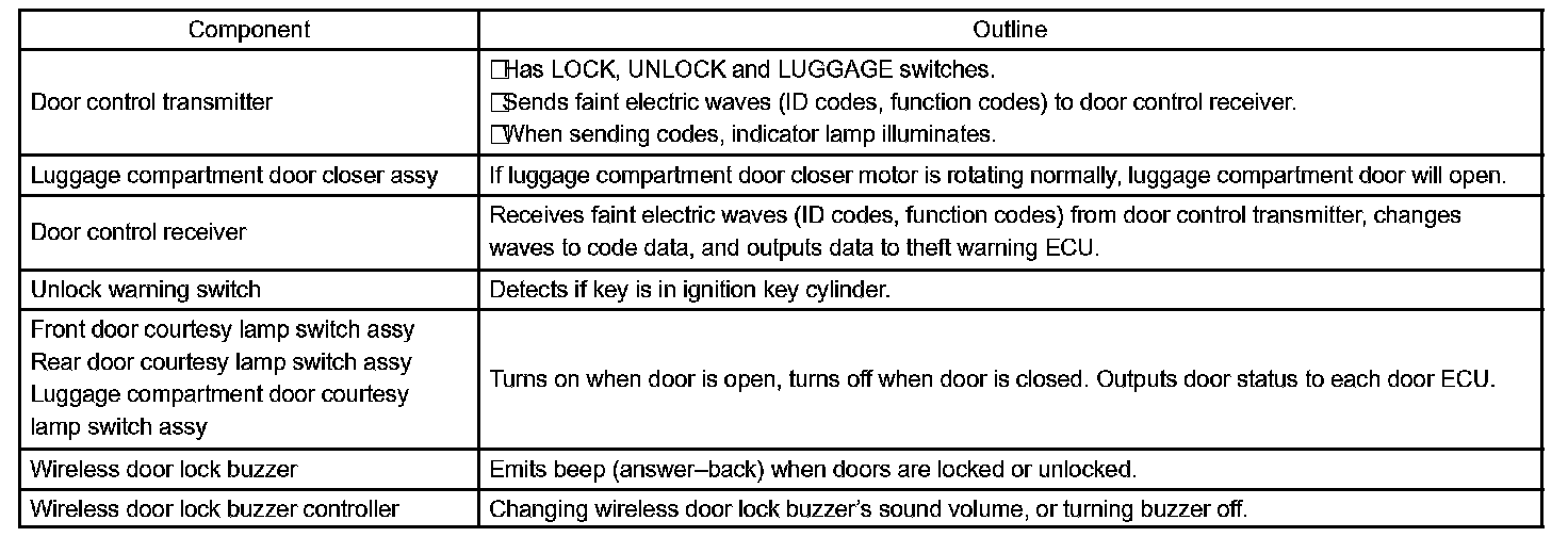 1. In this system, the door lock control receiver performs the code identification process and the theft warning ECU (theft deterrent ECU) operates the door lock control. A serial data link is provided for communication between the door control receiver and the theft warning ECU assy.