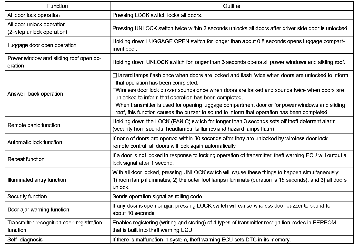 2. A key-integrated type transmitter is used and it contains the following 3 switches: the door lock switch, door unlock switch and luggage open switch.