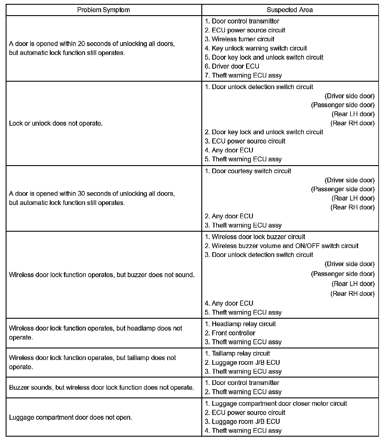 Problem Symptoms Table: