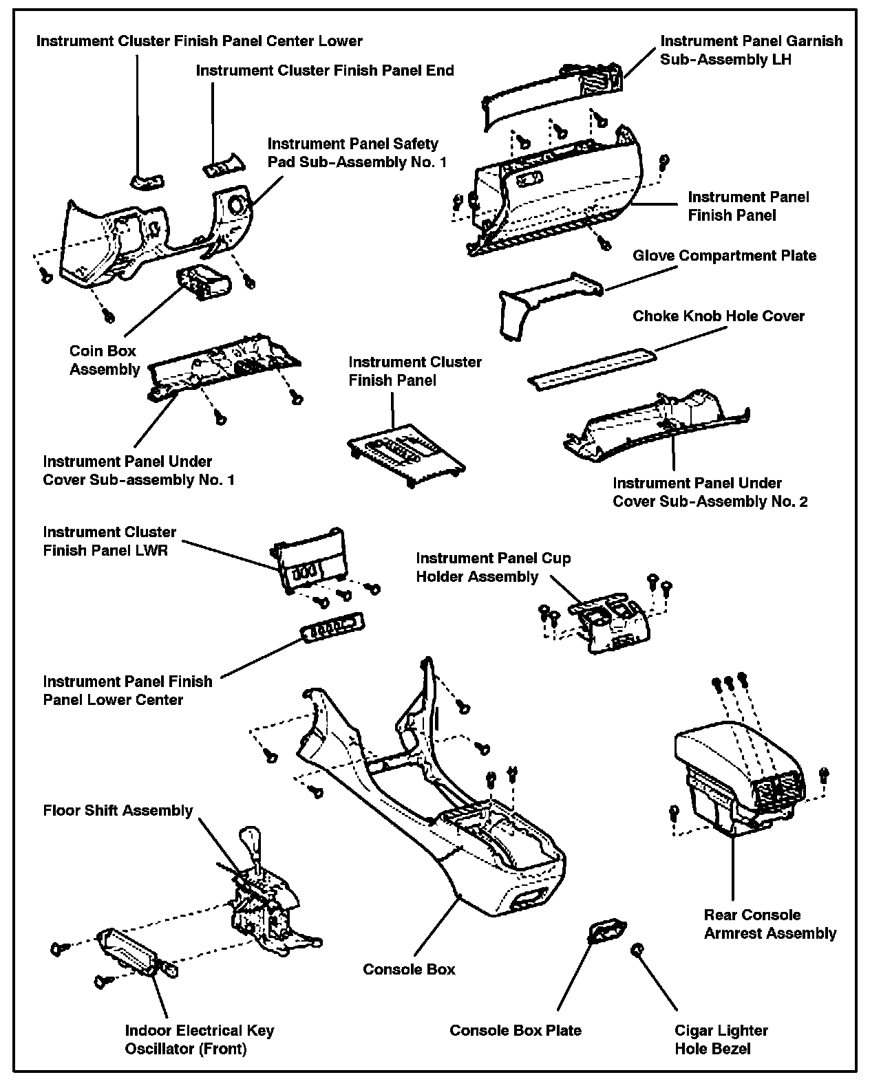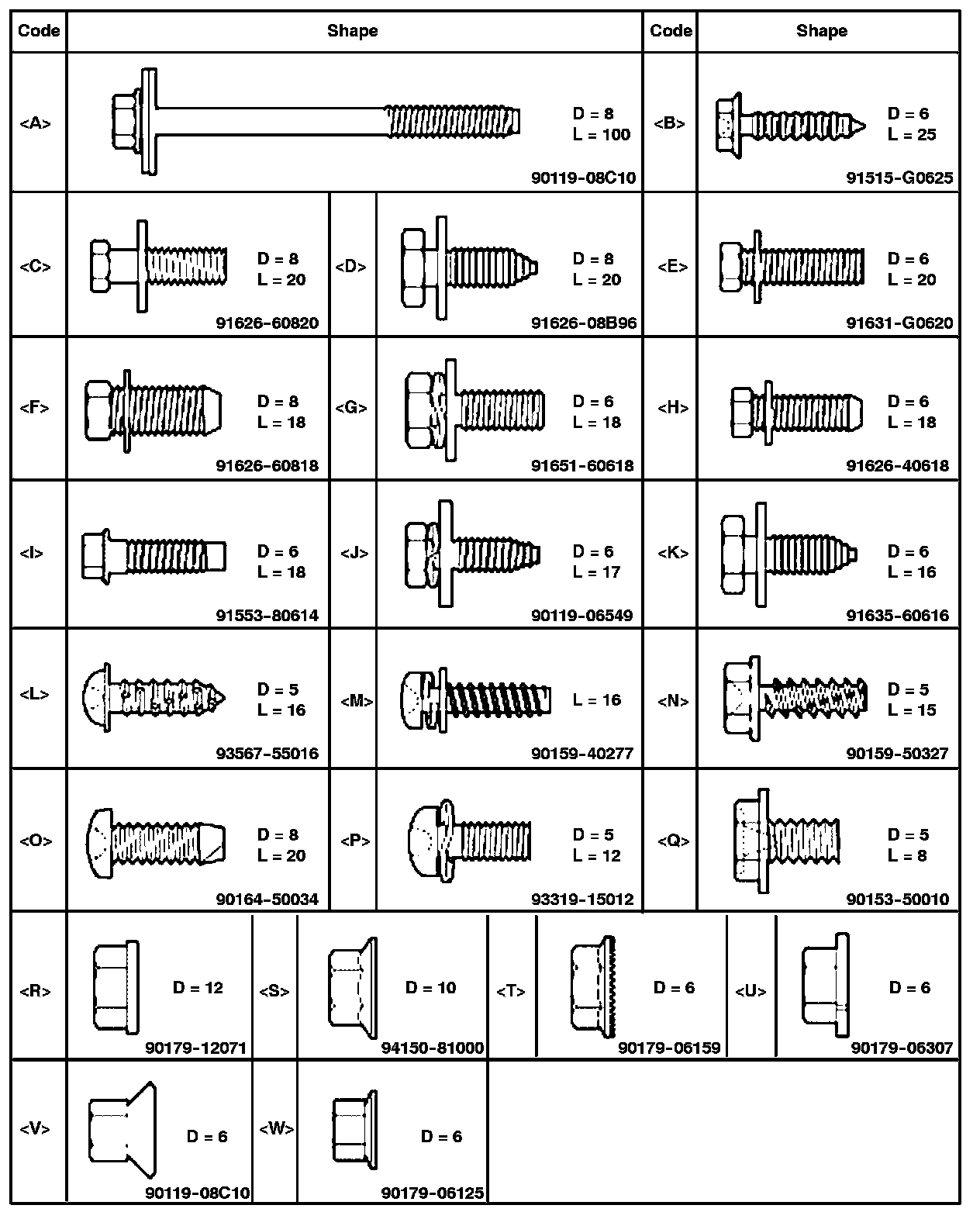 The bolts, screws and nuts, necessary for installation and removal of the instrument panel, are shown in the illustration with alphabet code.
