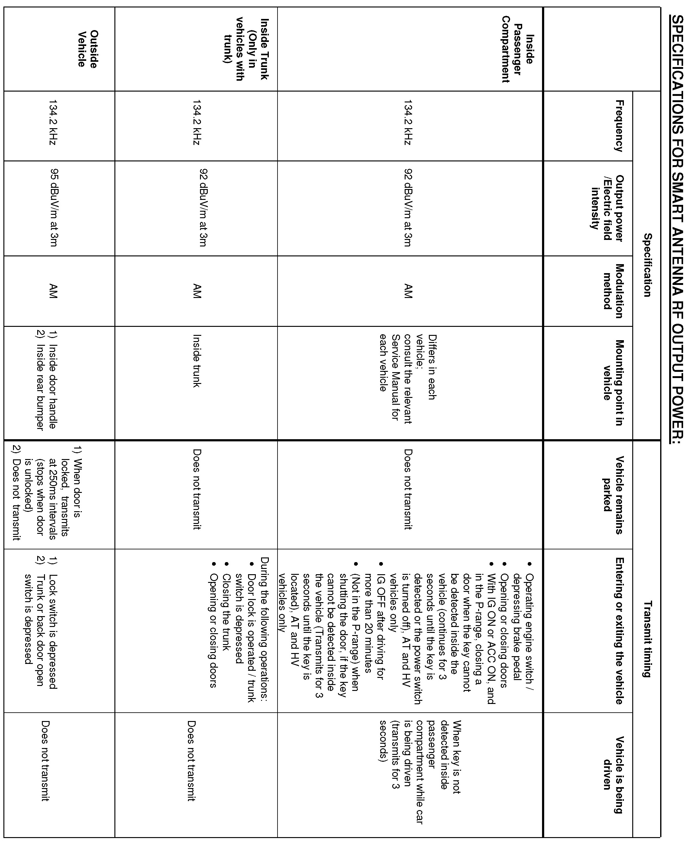 Some customers may inquire about the frequency used by the Smart Key system on various models. This bulletin contains the applicable specifications of the Smart Key system.