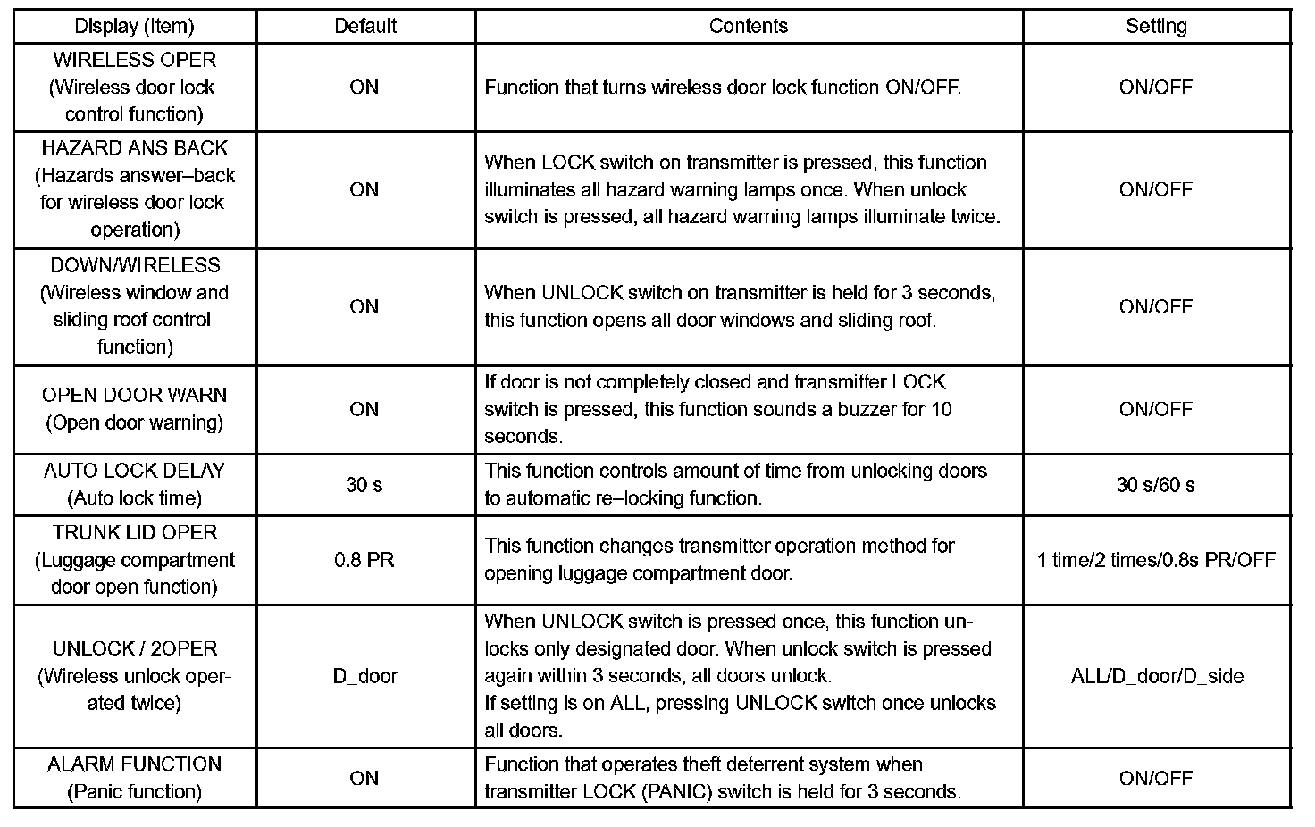 - When troubleshooting a function, first make sure that the function is not set to OFF. Wireless door lock: