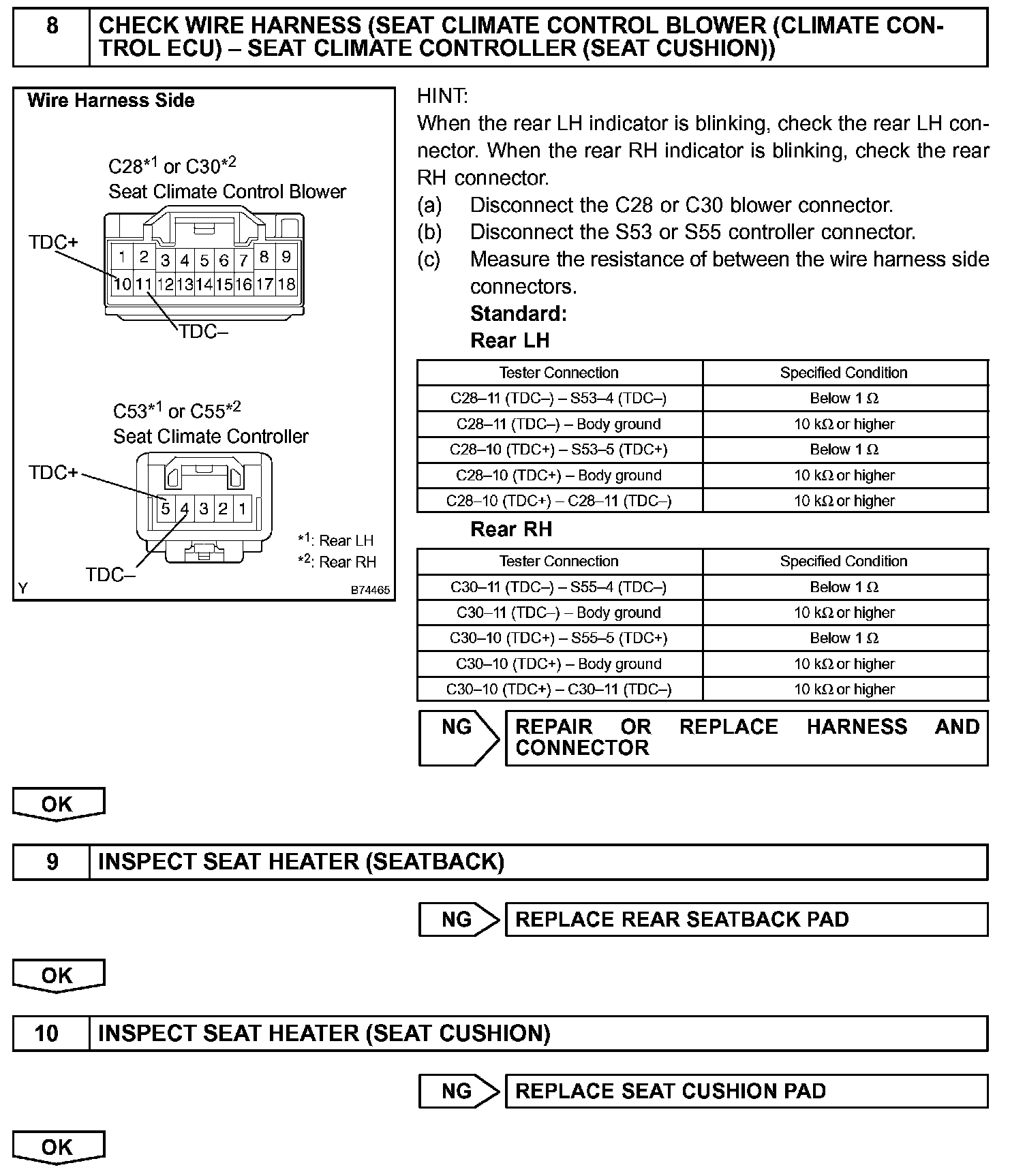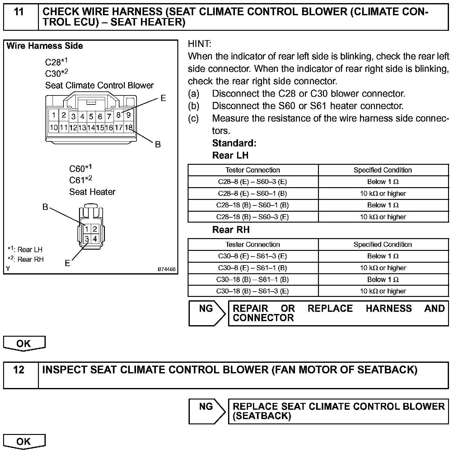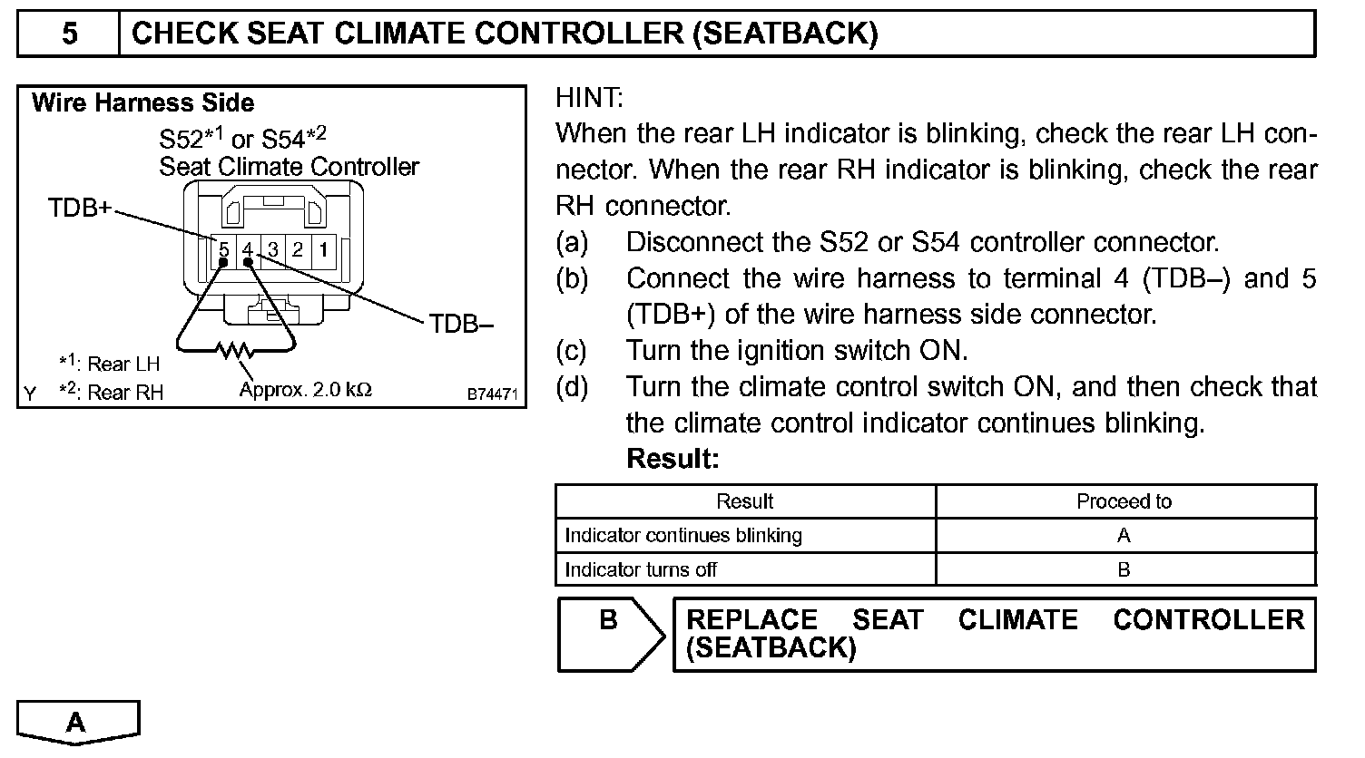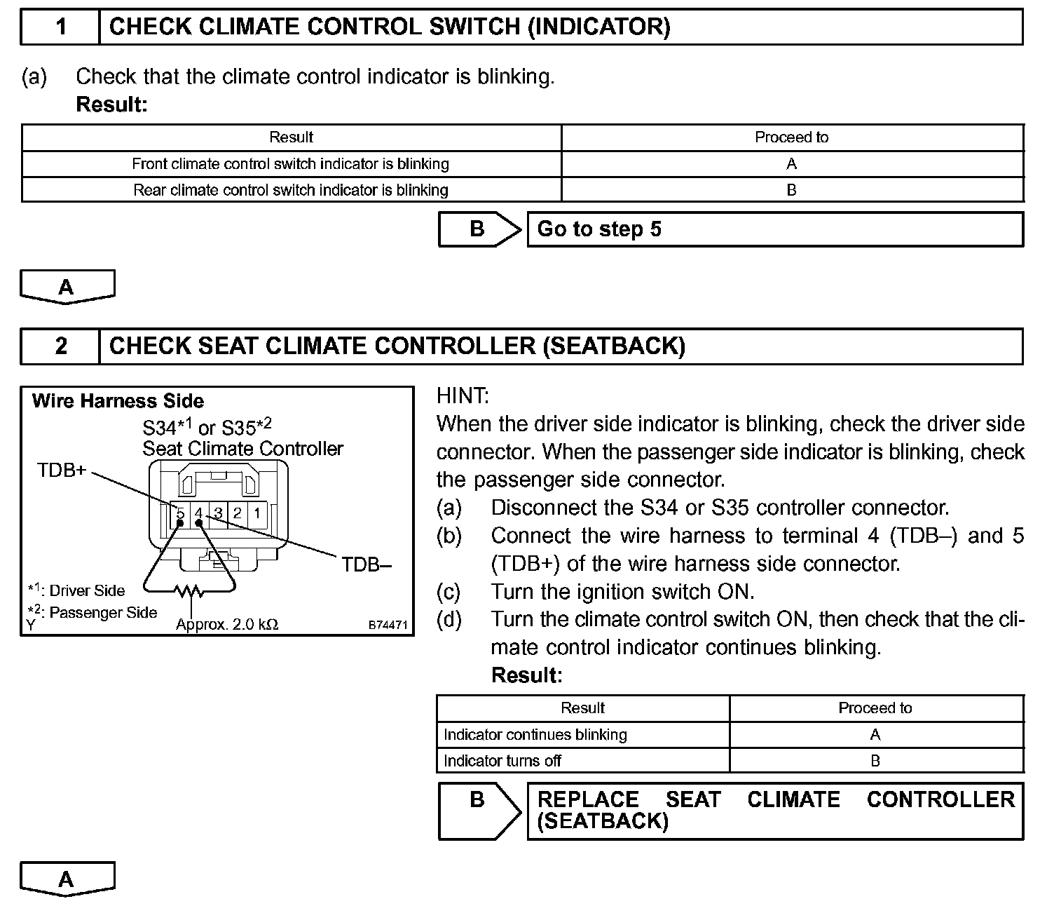 As a result of a short circuit, overcurrent may occur in the Peltier element of the seat climate controller, fan motor or rear seat heater. If this happens, output from the Peltier element, fan motor, rear seat heater and idle-up signal (not including the front passenger side) will be stopped and the indicator illuminates according to blinking pattern 1.