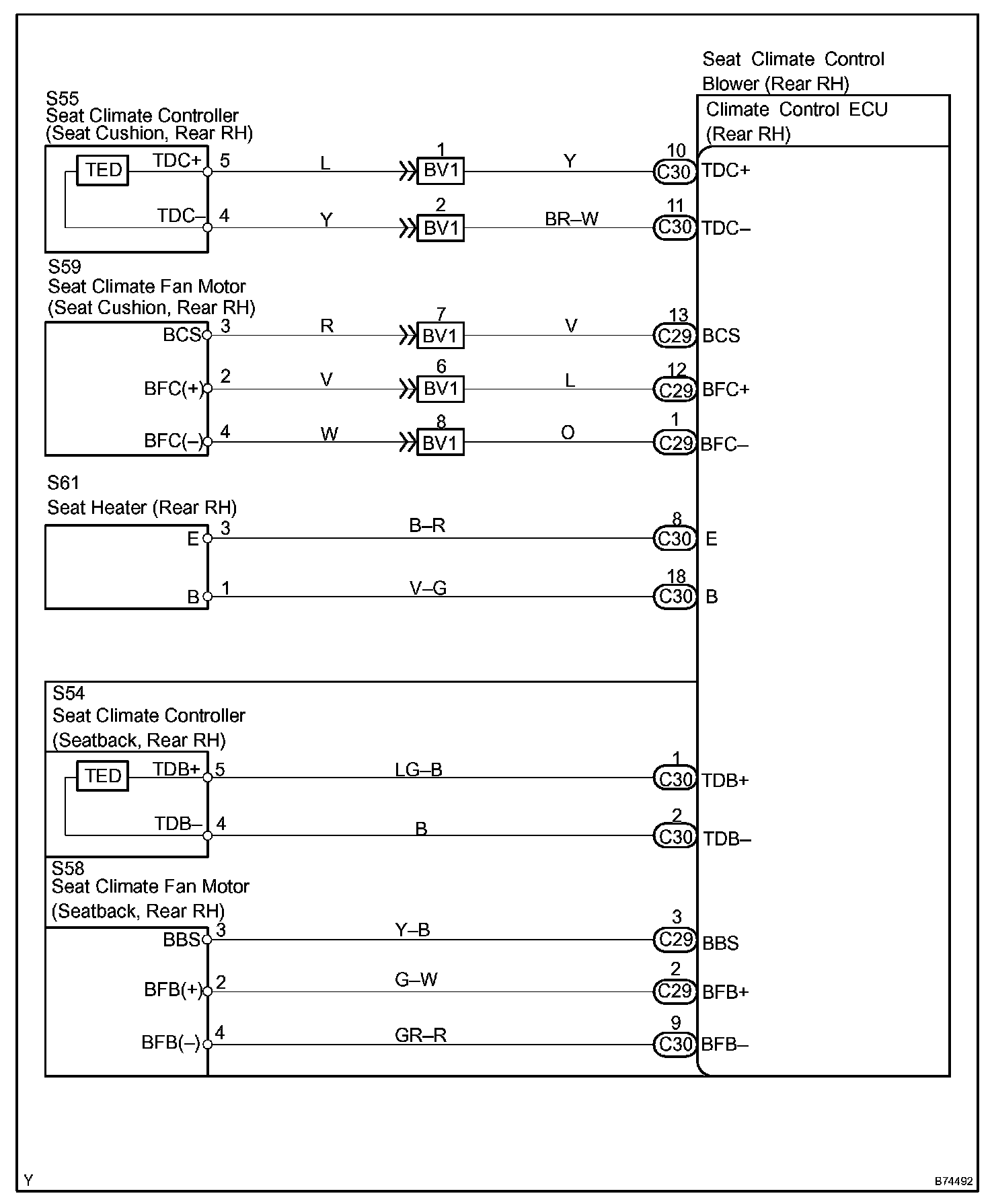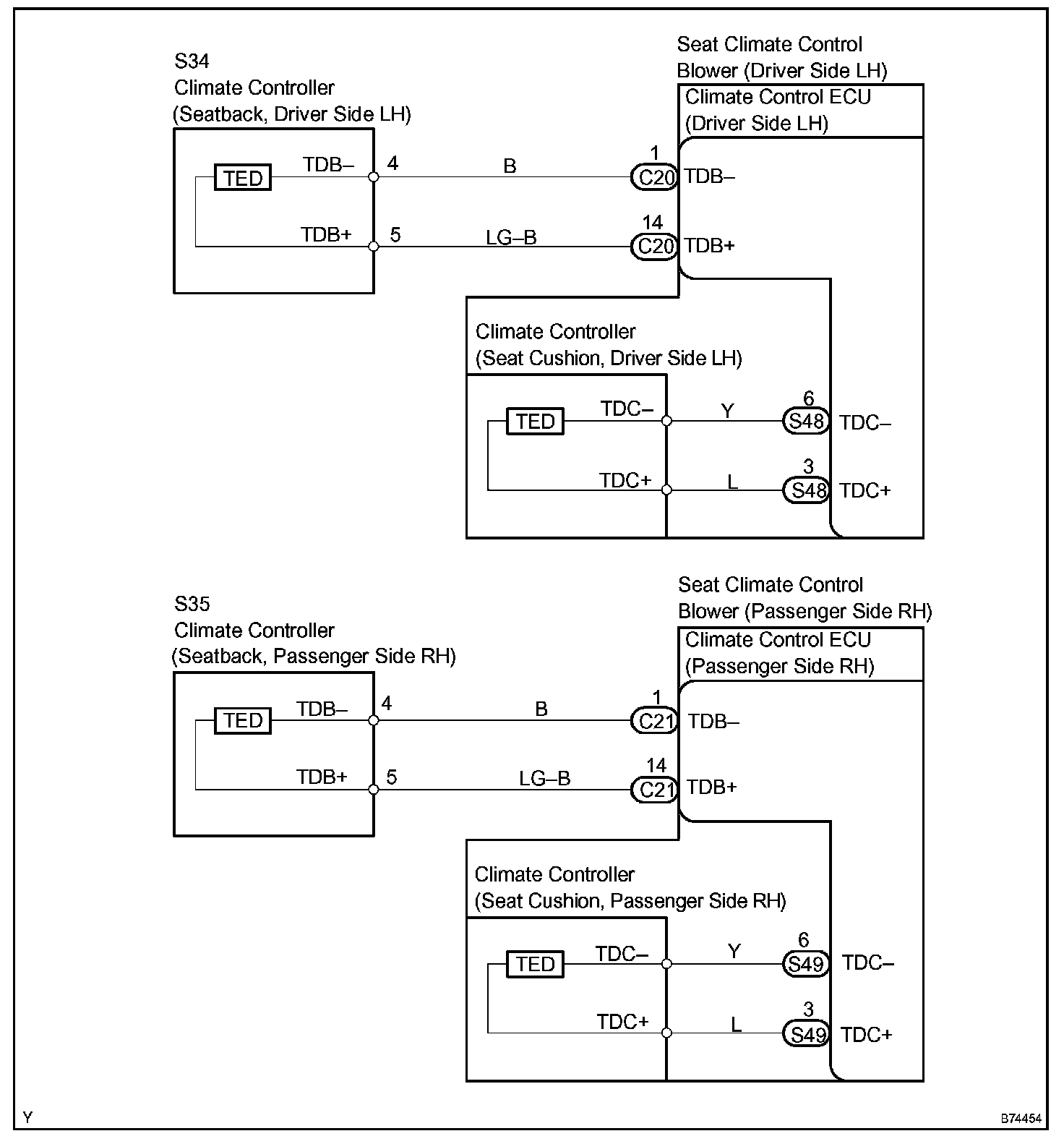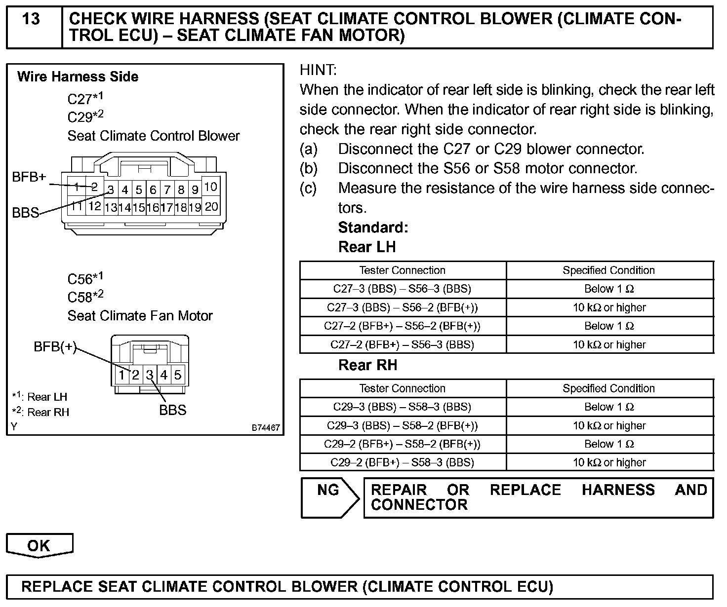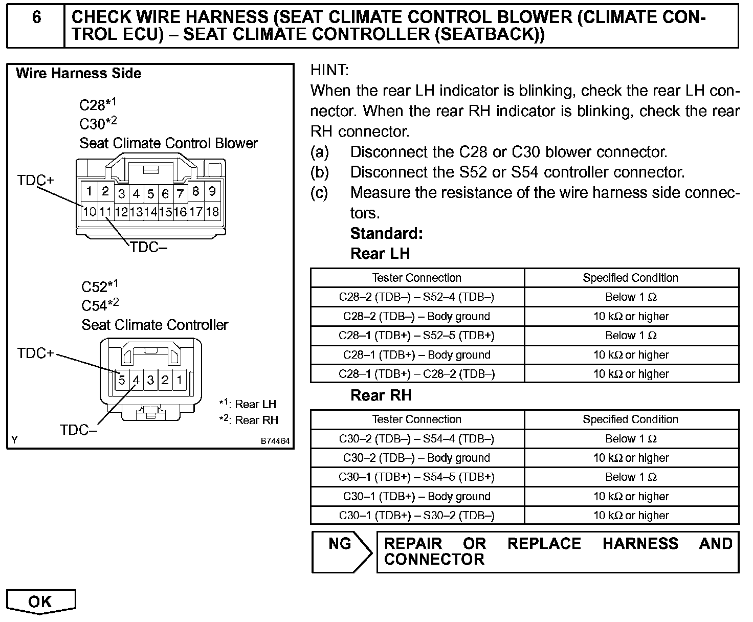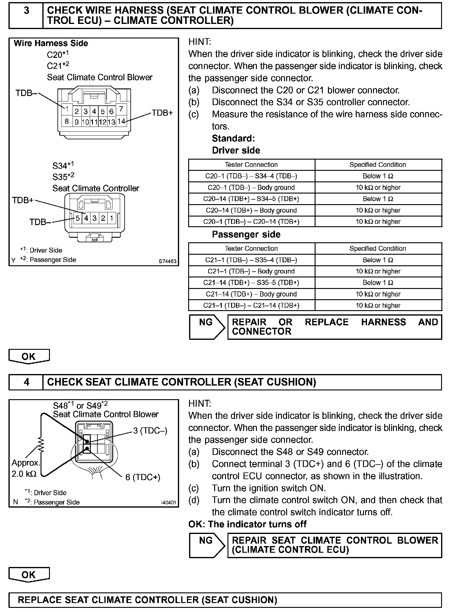 As a result of a short circuit, overcurrent may occur in the Peltier element of the seat climate controller, fan motor or rear seat heater. If this happens, output from the Peltier element, fan motor, rear seat heater and idle-up signal (not including the front passenger side) will be stopped and the indicator illuminates according to blinking pattern 1.