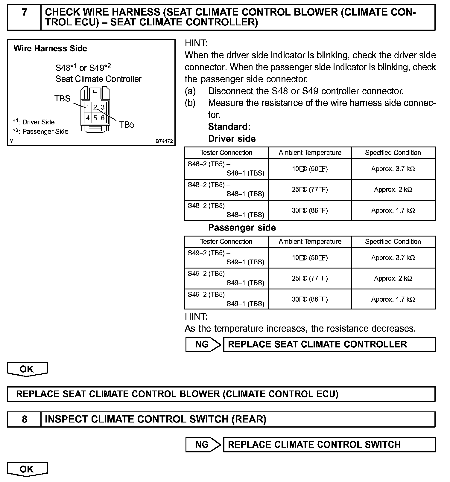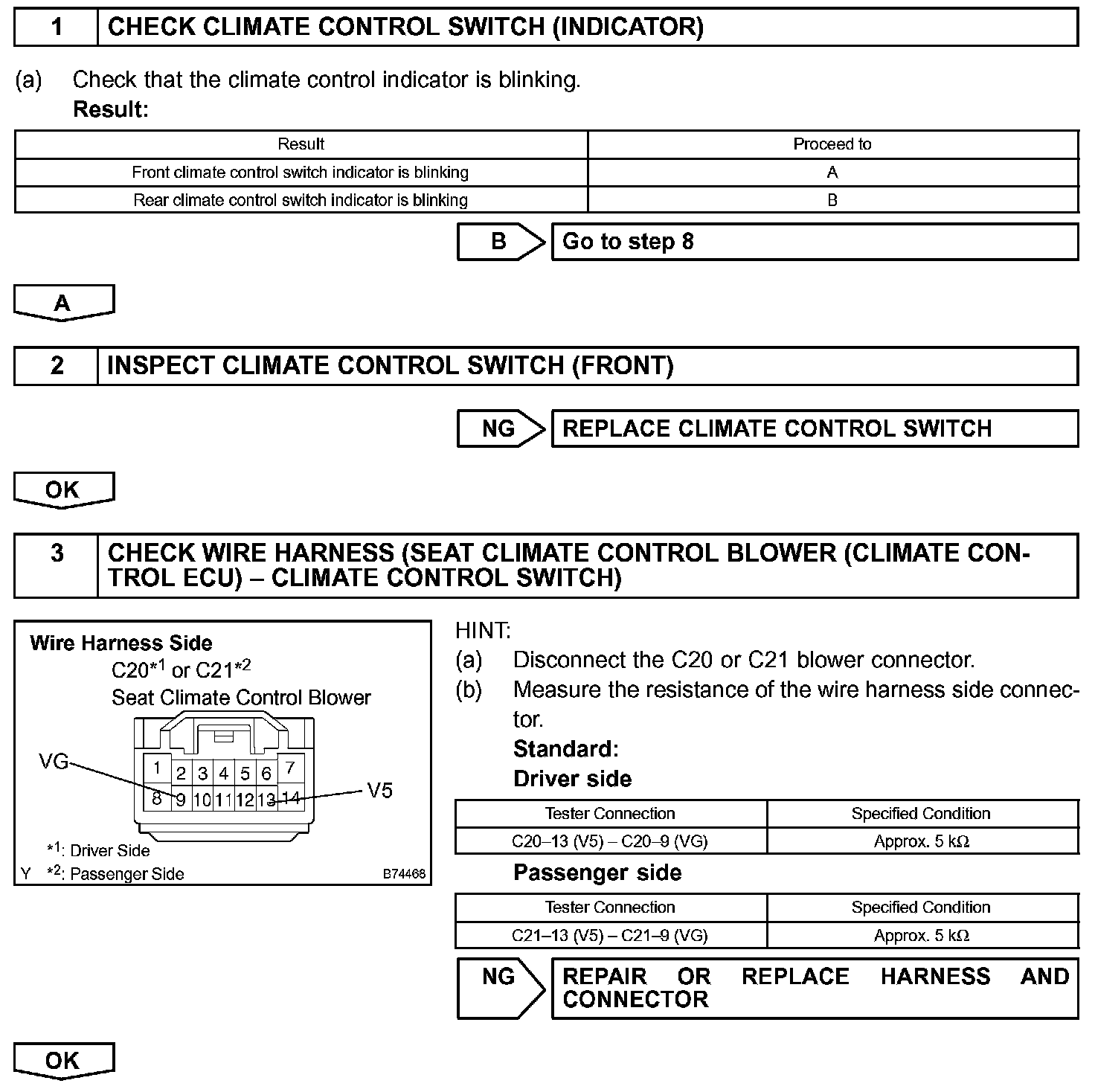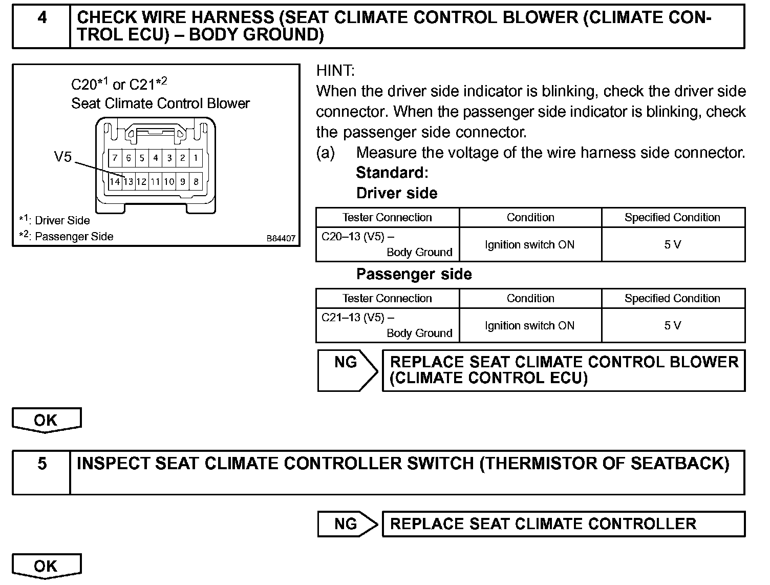 As a result of an short circuit, the ECU may not be able to provide 5 V of power voltage to the seat climate controller thermistor circuit, climate control switch's volume control circuit or rear seat heater thermistor circuit. If this happens, all output will be stopped and the indicator illuminates according to blinking pattern 3.