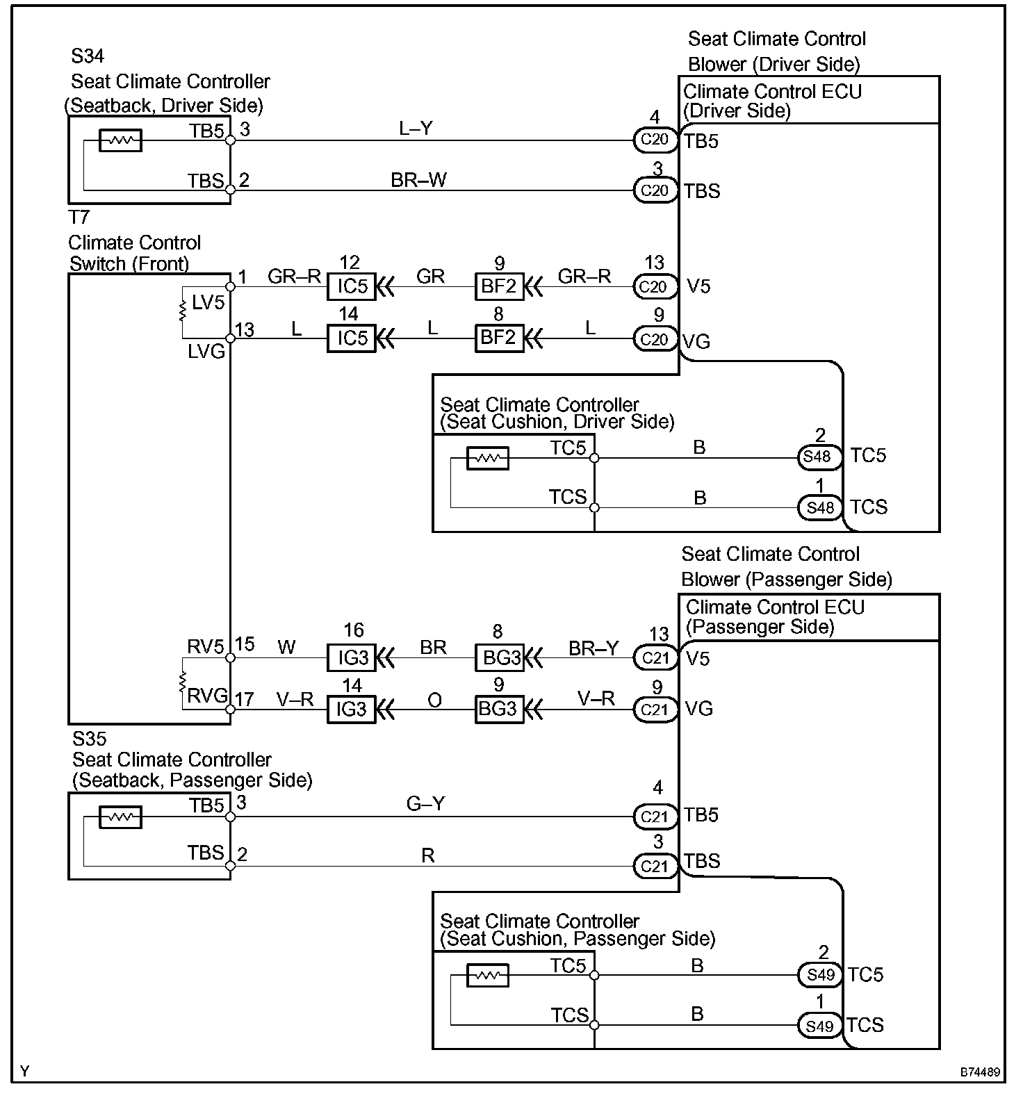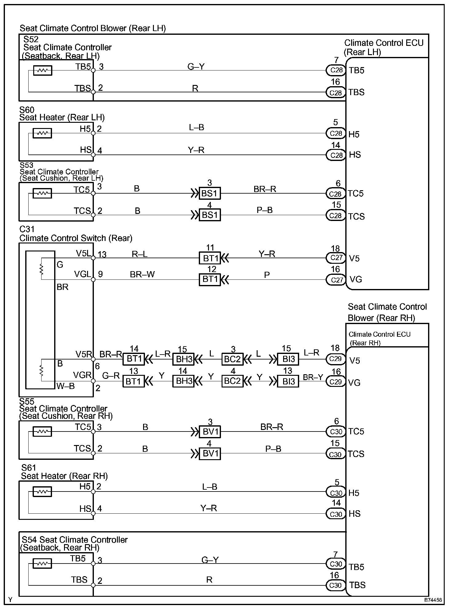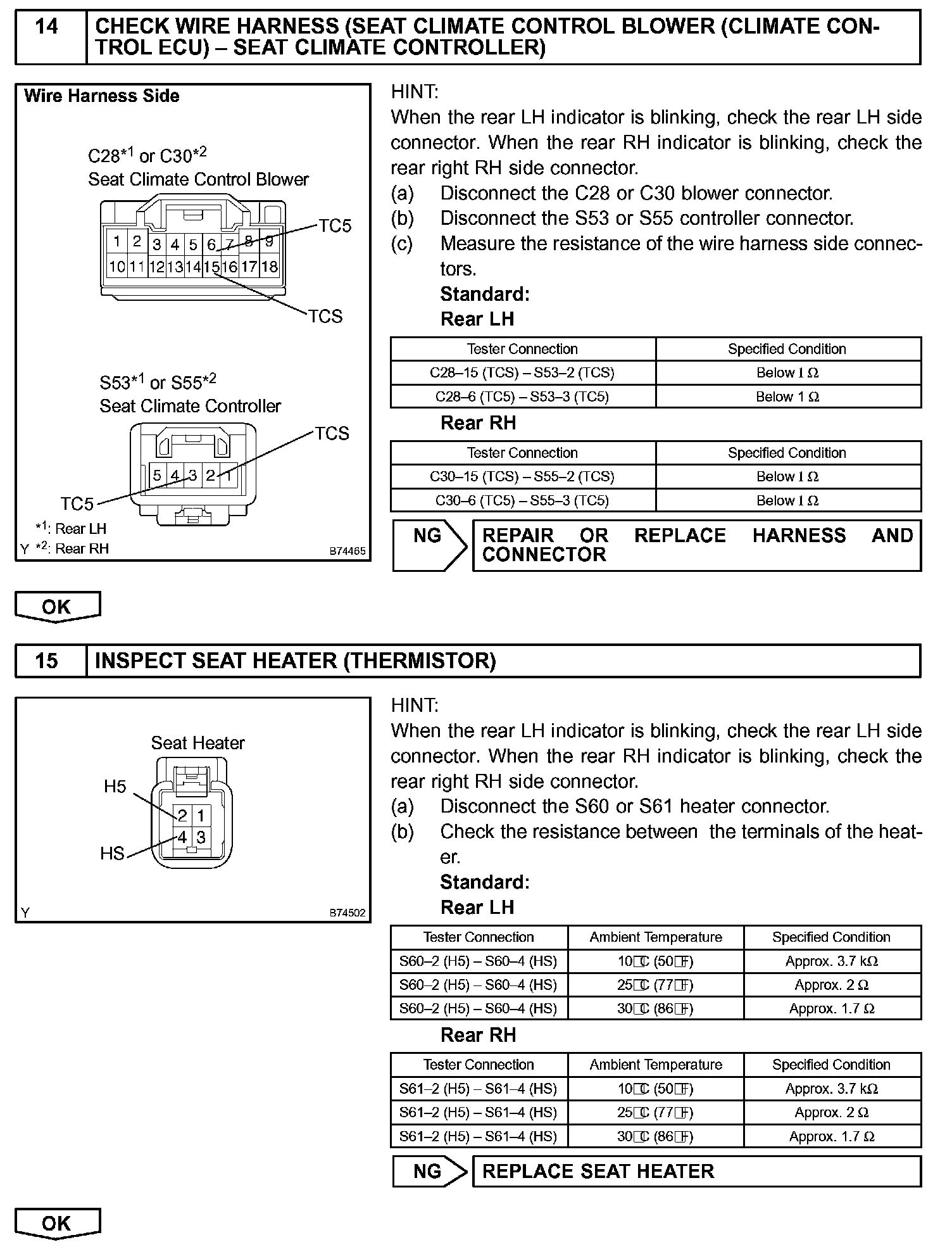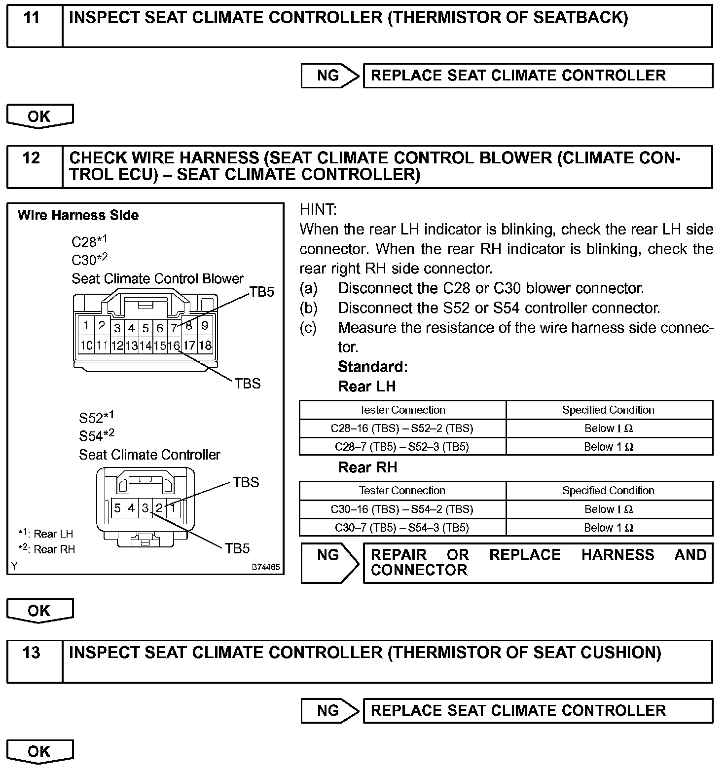 As a result of an short circuit, the ECU may not be able to provide 5 V of power voltage to the seat climate controller thermistor circuit, climate control switch's volume control circuit or rear seat heater thermistor circuit. If this happens, all output will be stopped and the indicator illuminates according to blinking pattern 3.