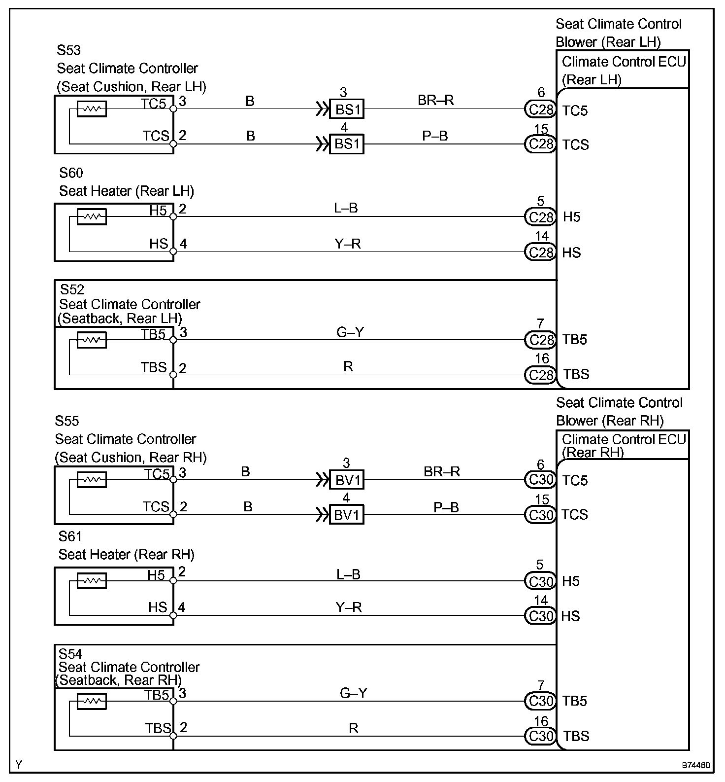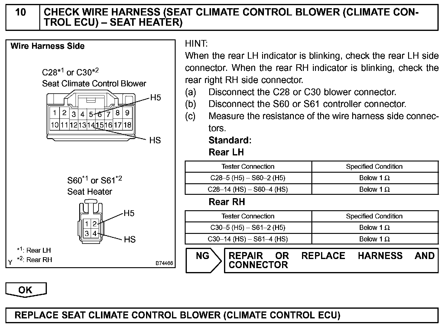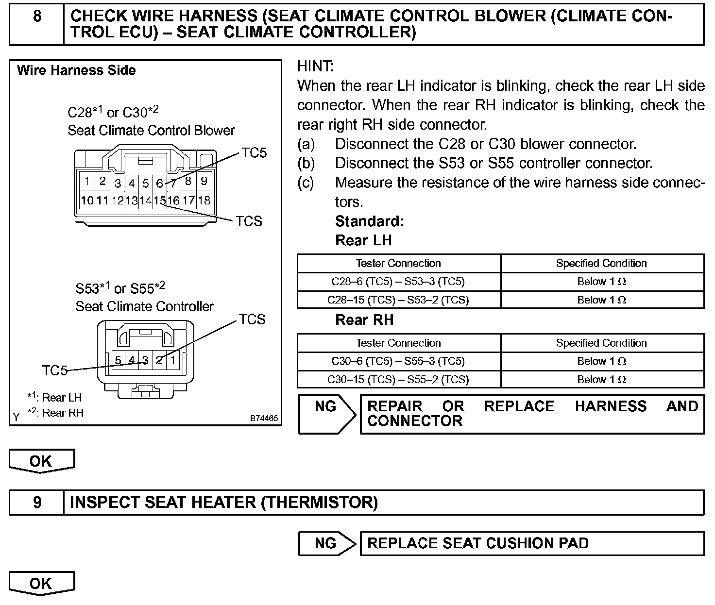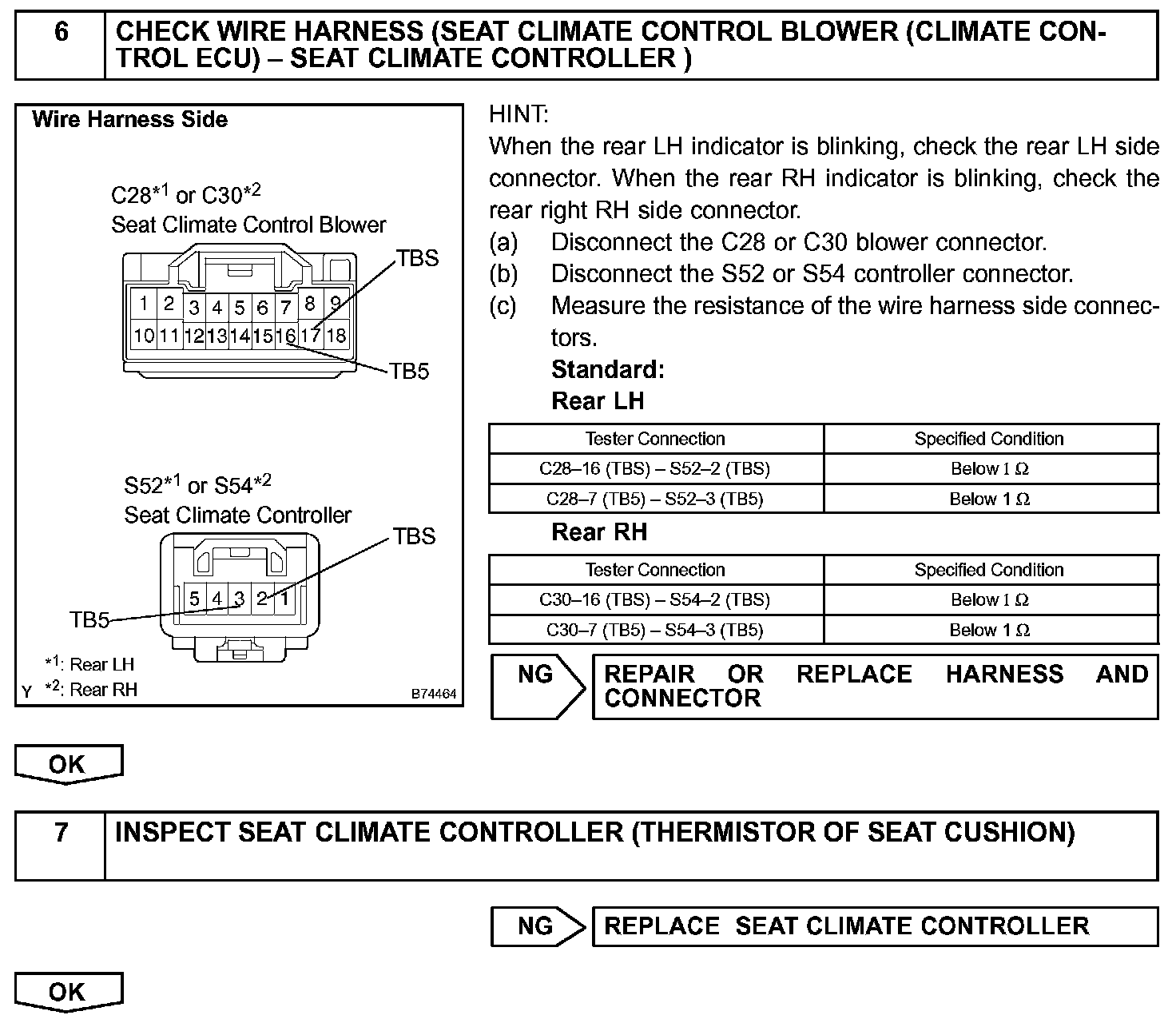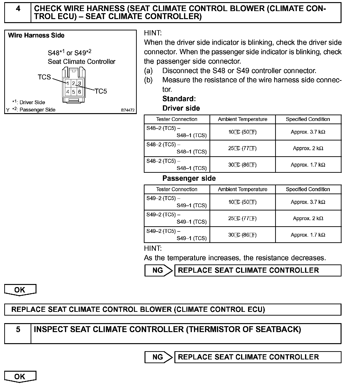 The thermistor circuit inside the seat climate controller or the thermistor circuit of the rear seat heater may become open or short circuited, or the thermistor's output values may not change because it is damaged. If these situations occur, output from the Peltier element, fan motor, rear seat heater, idle-up signal (not including the front passenger side) will be stopped and the indicator illuminates according to blinking pattern 4.
