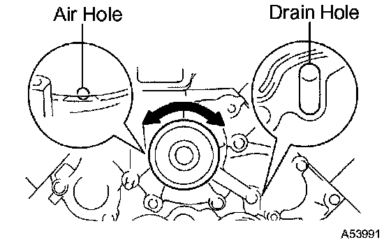 2. Turn the pulley, and check that the water pump bearing moves smoothly and quietly.
