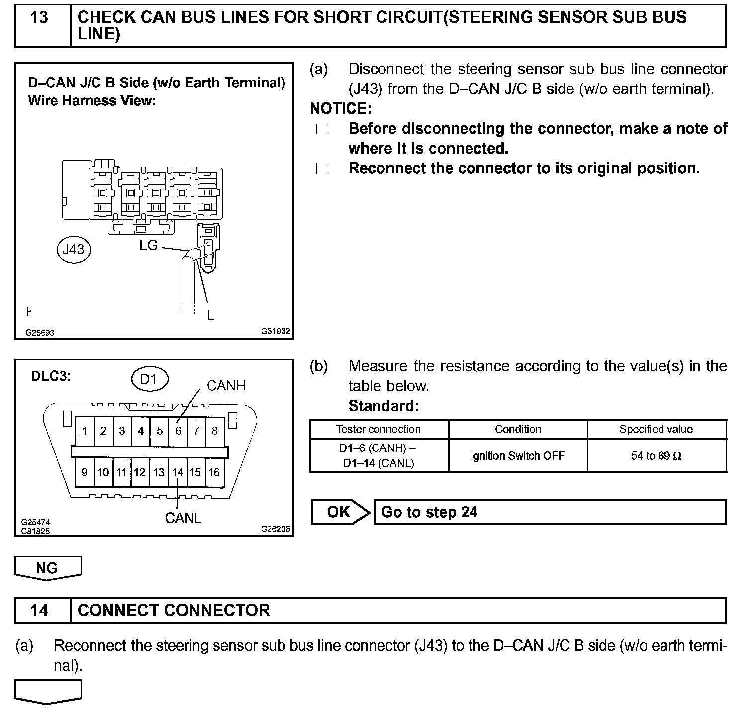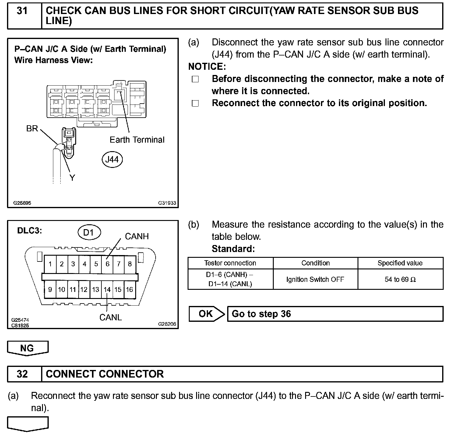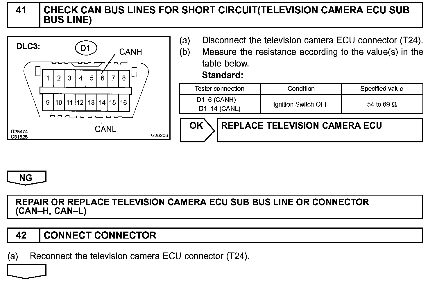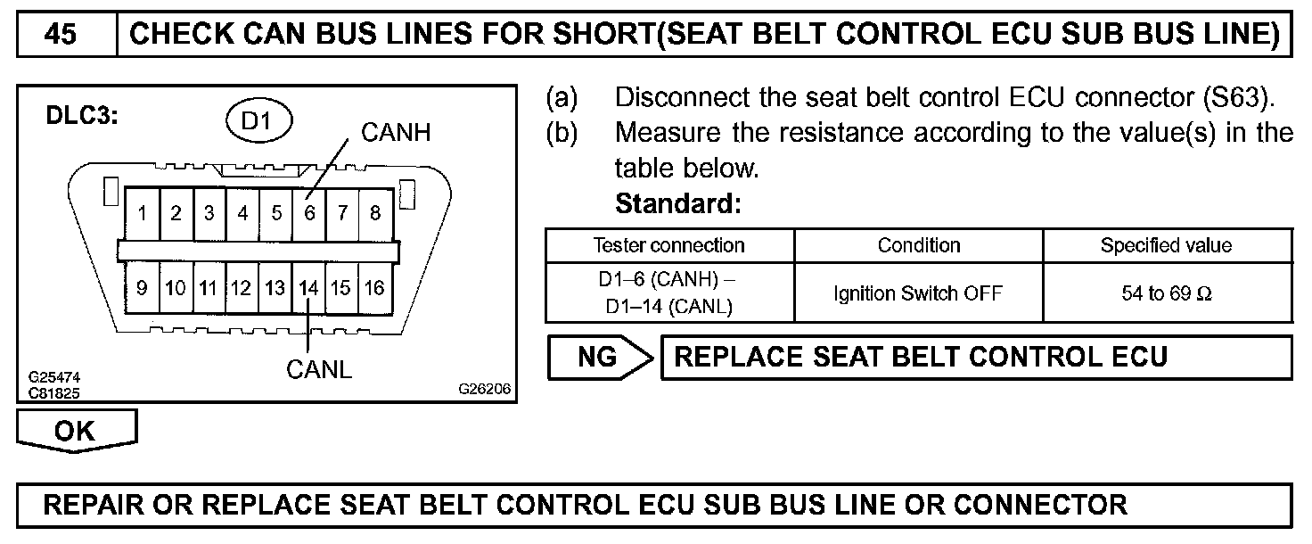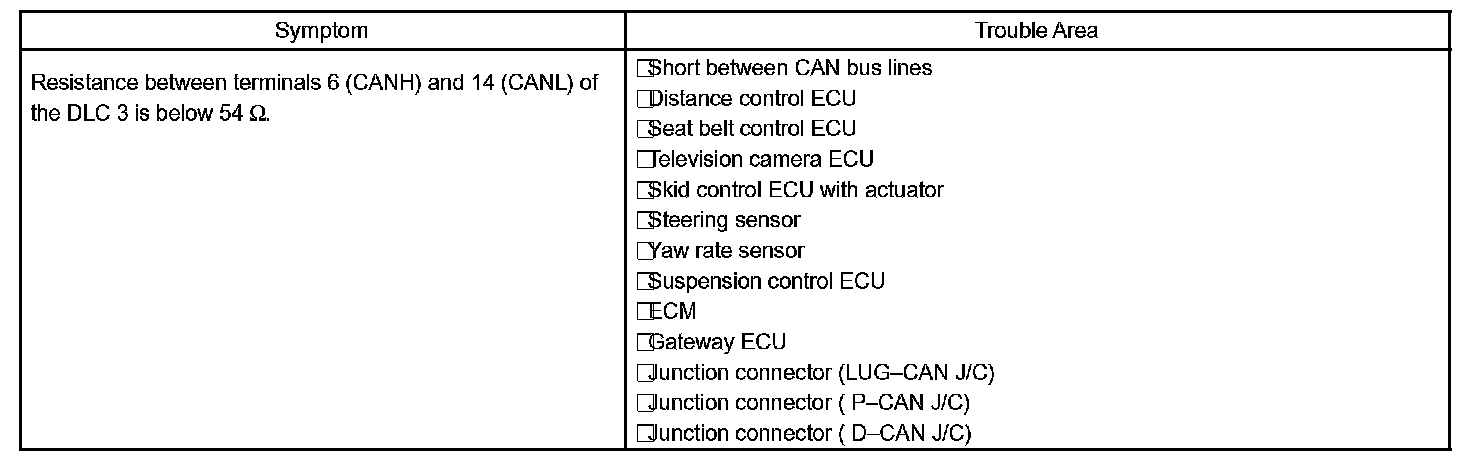 There may be a short circuit between the CAN bus lines when the resistance between terminals 6 (CANH) and 14 (CANL) of the DLC3 is below 54 Ohm.