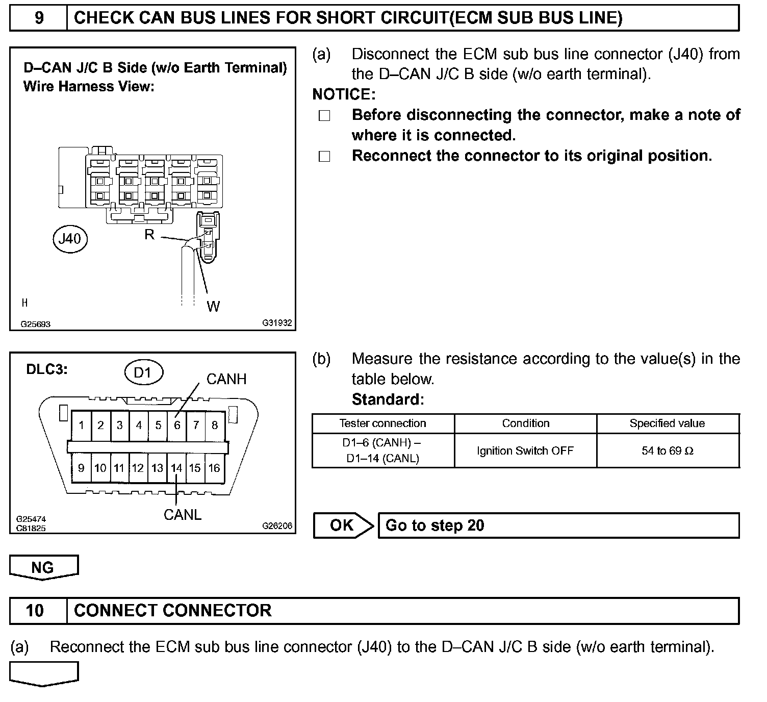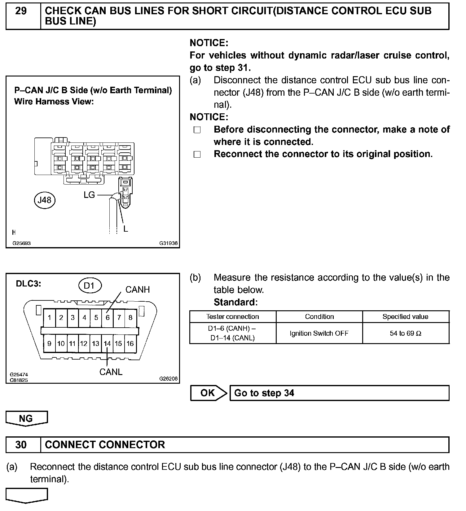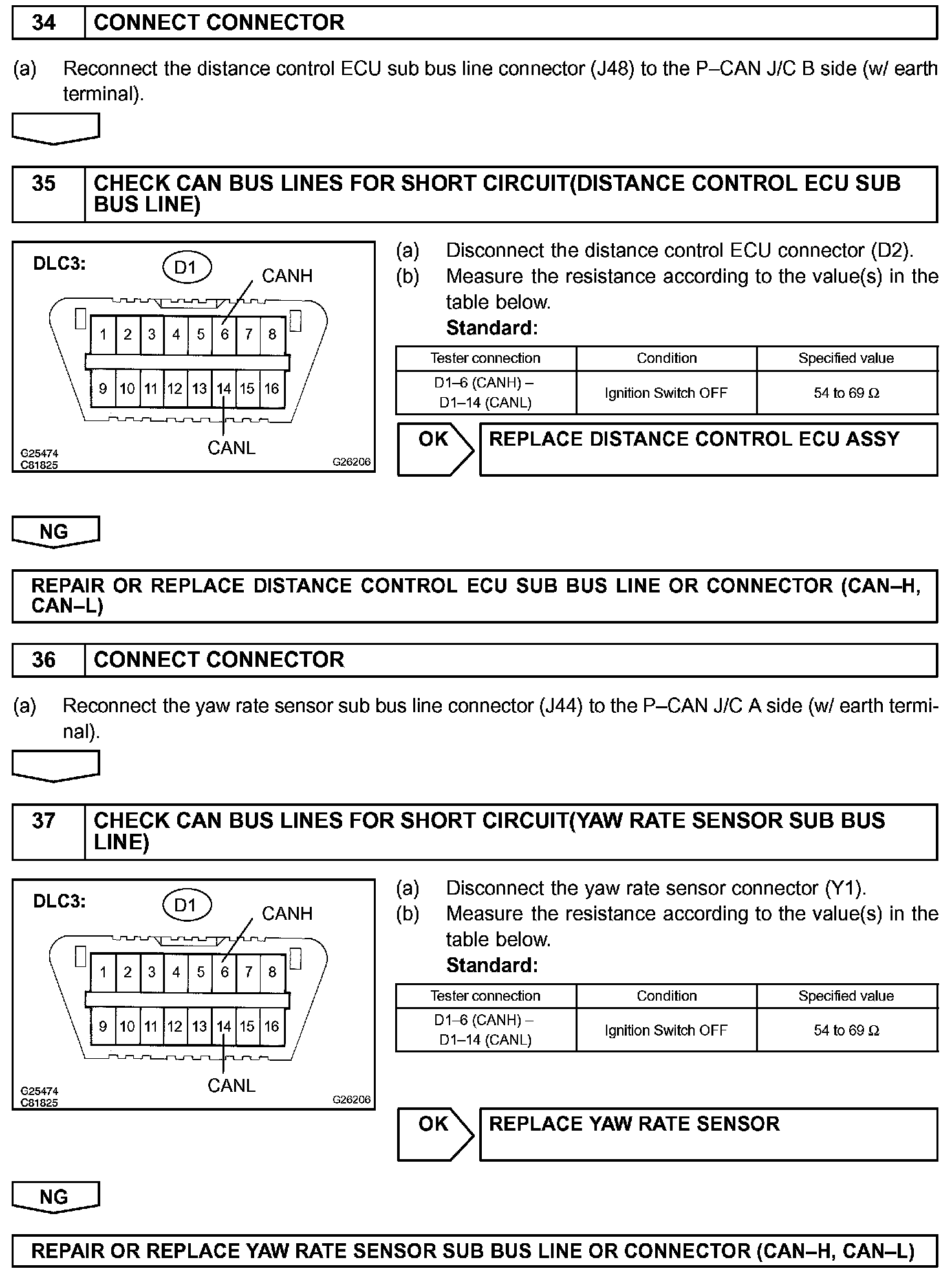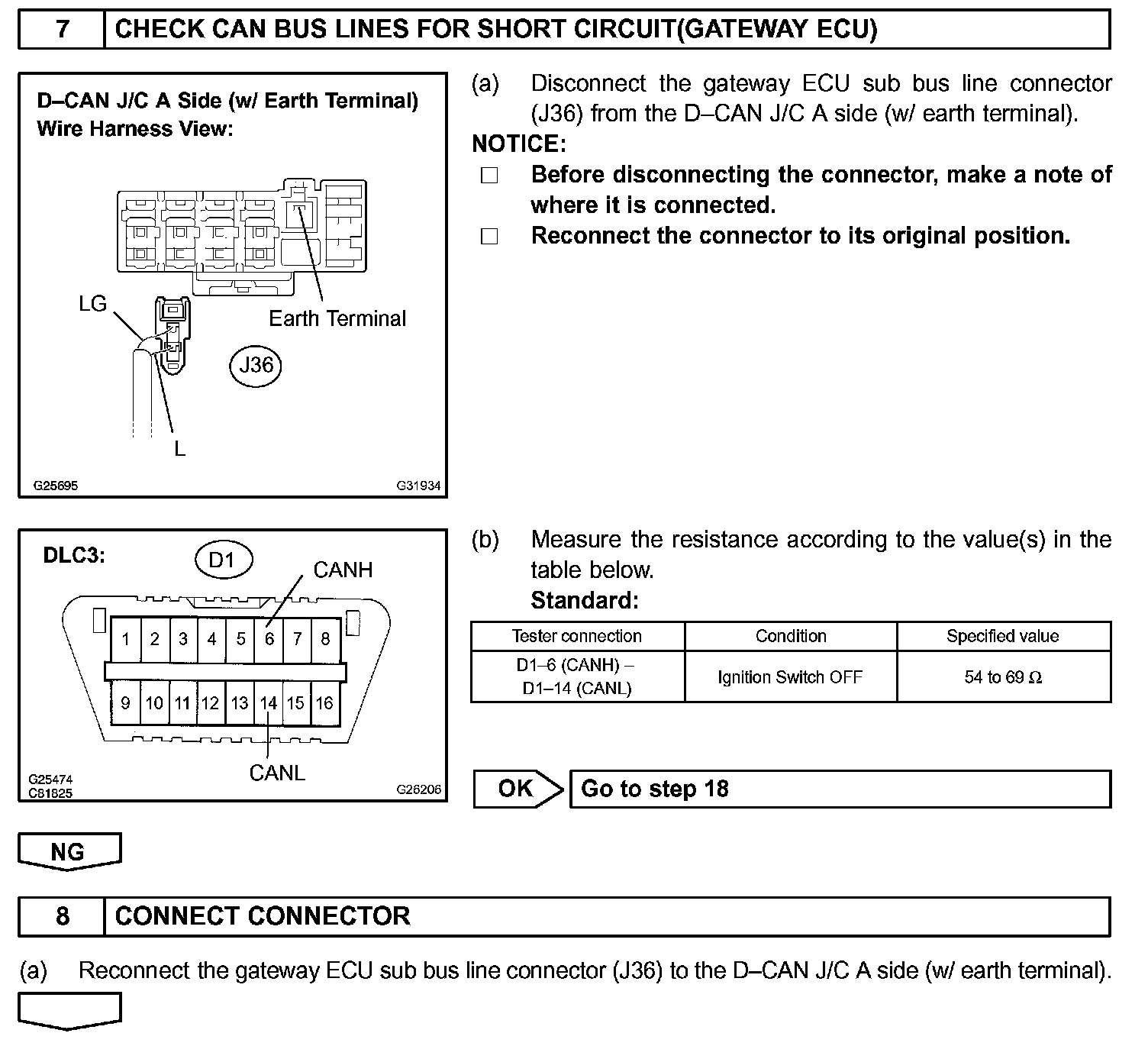 There may be a short circuit between the CAN bus lines when the resistance between terminals 6 (CANH) and 14 (CANL) of the DLC3 is below 54 Ohm.