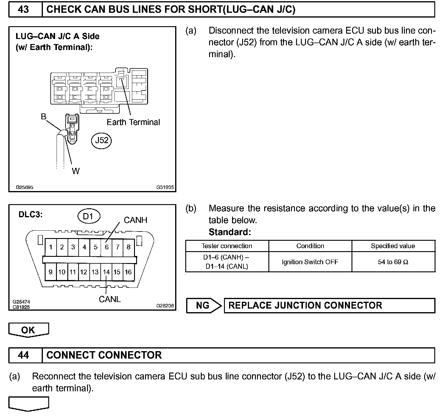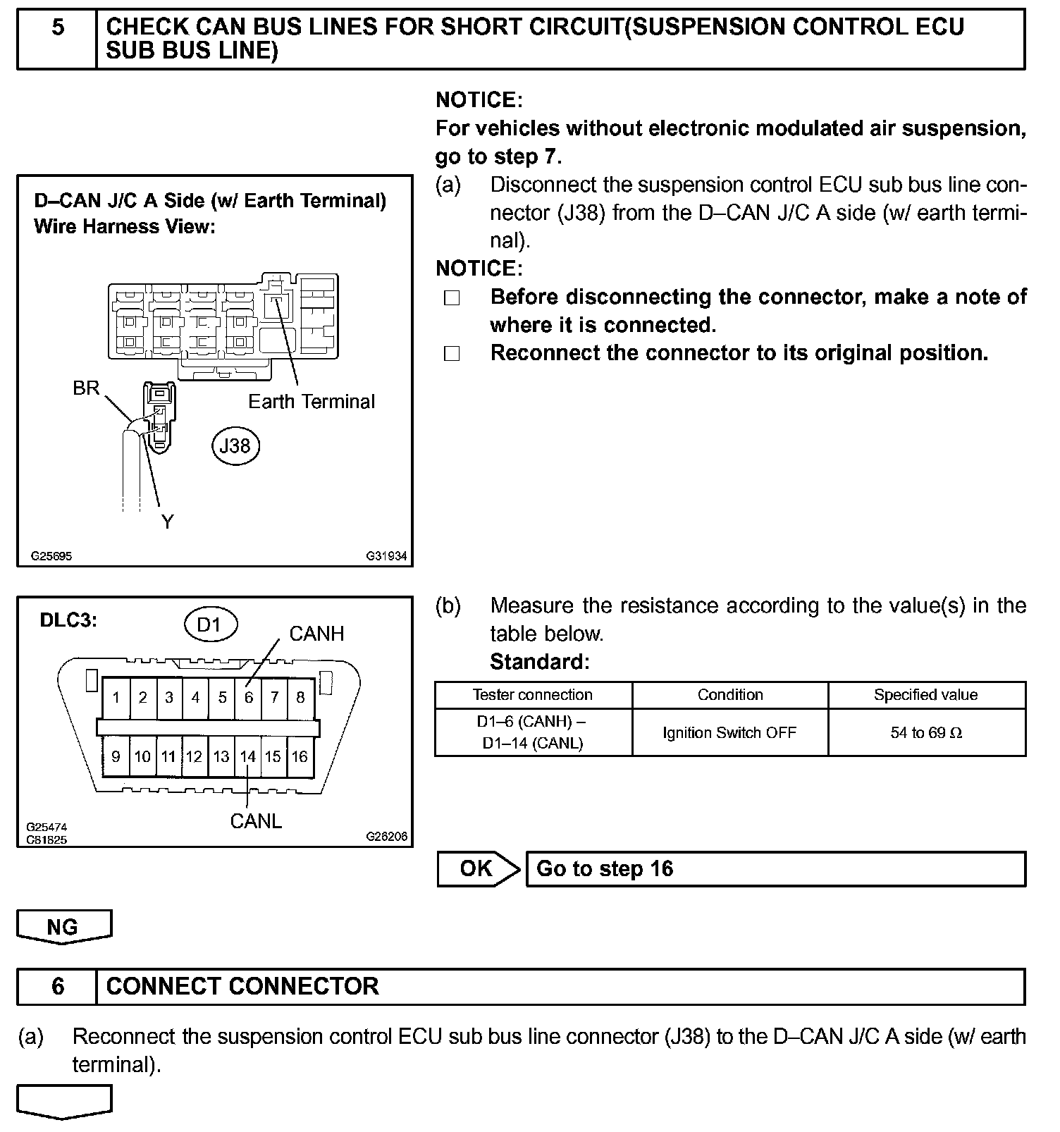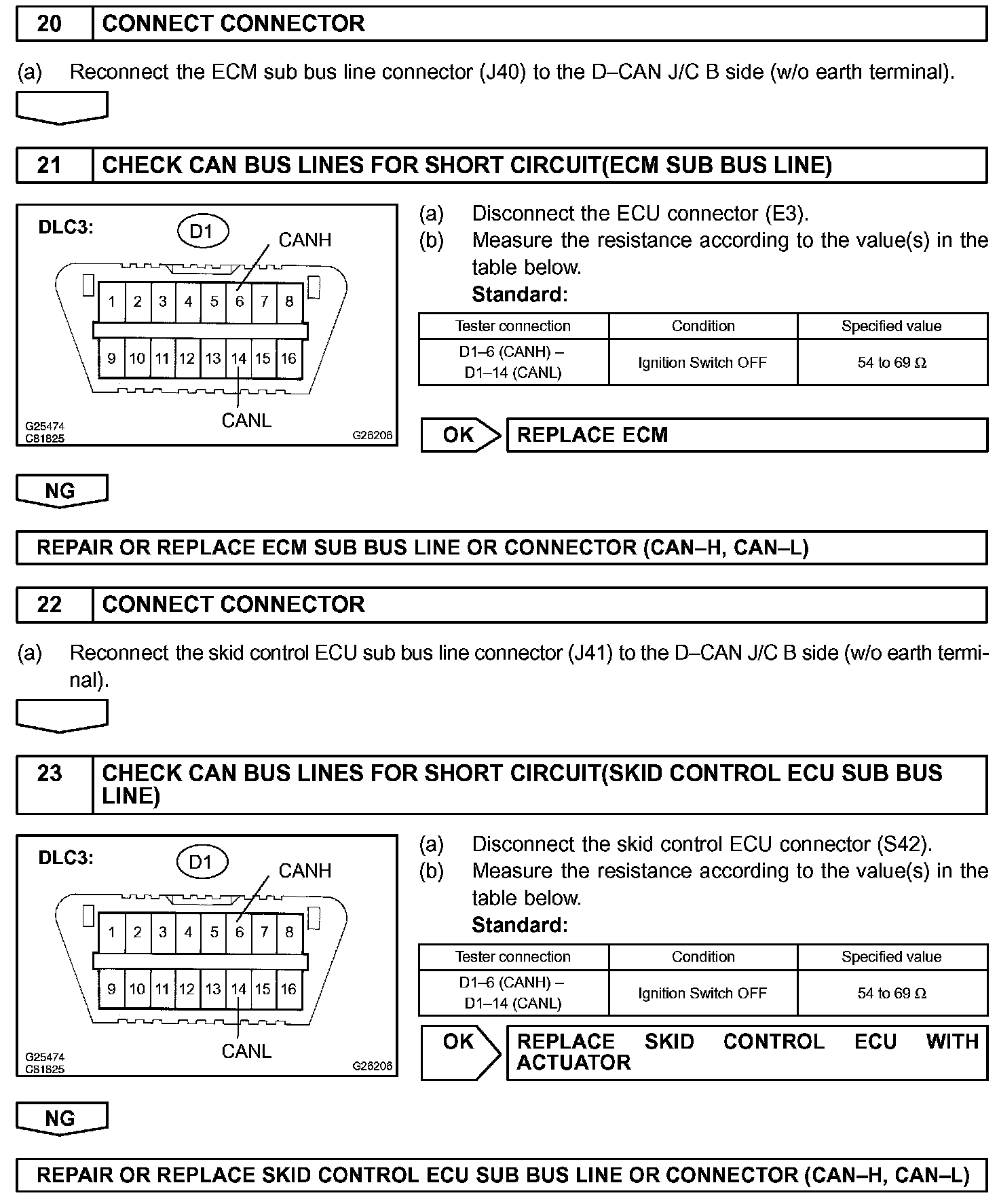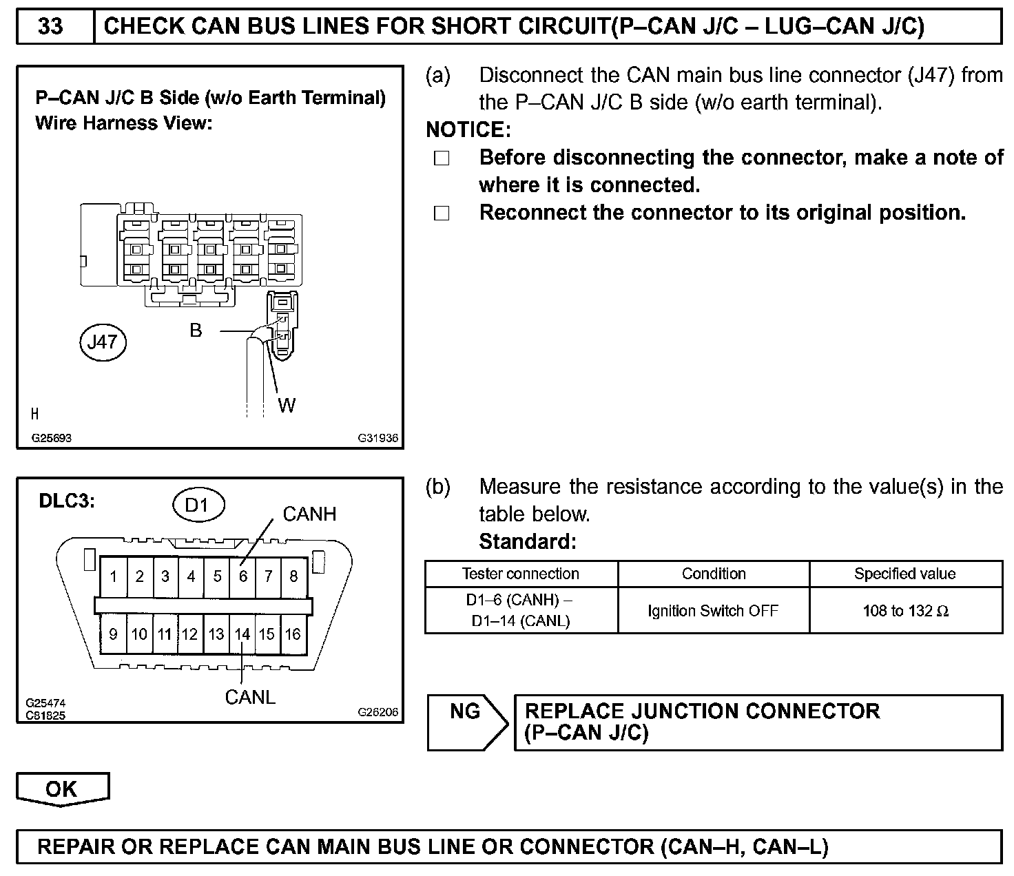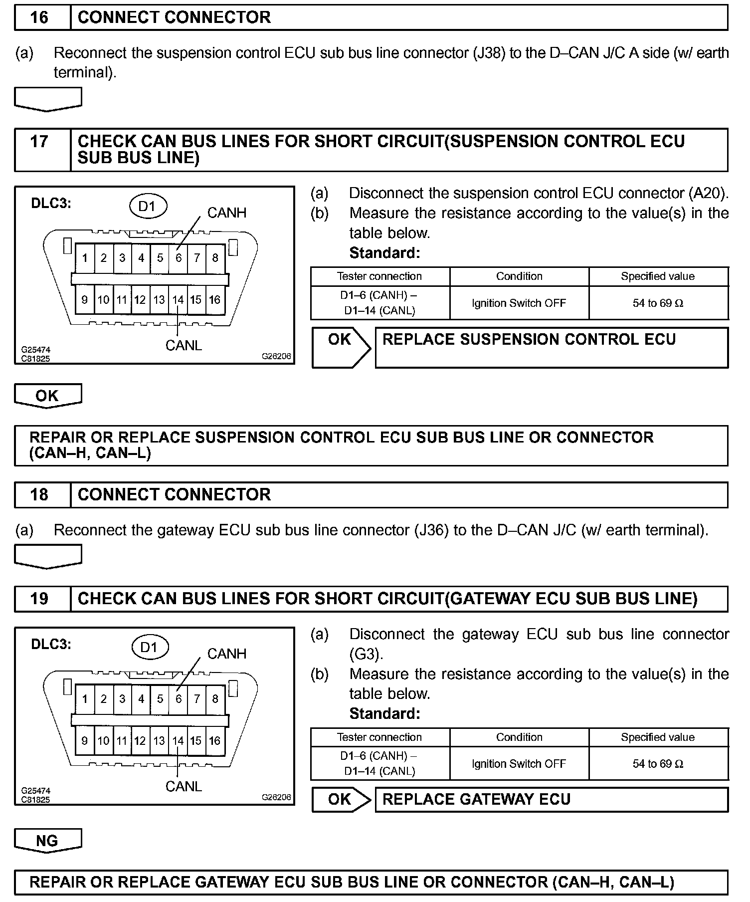 There may be a short circuit between the CAN bus lines when the resistance between terminals 6 (CANH) and 14 (CANL) of the DLC3 is below 54 Ohm.
