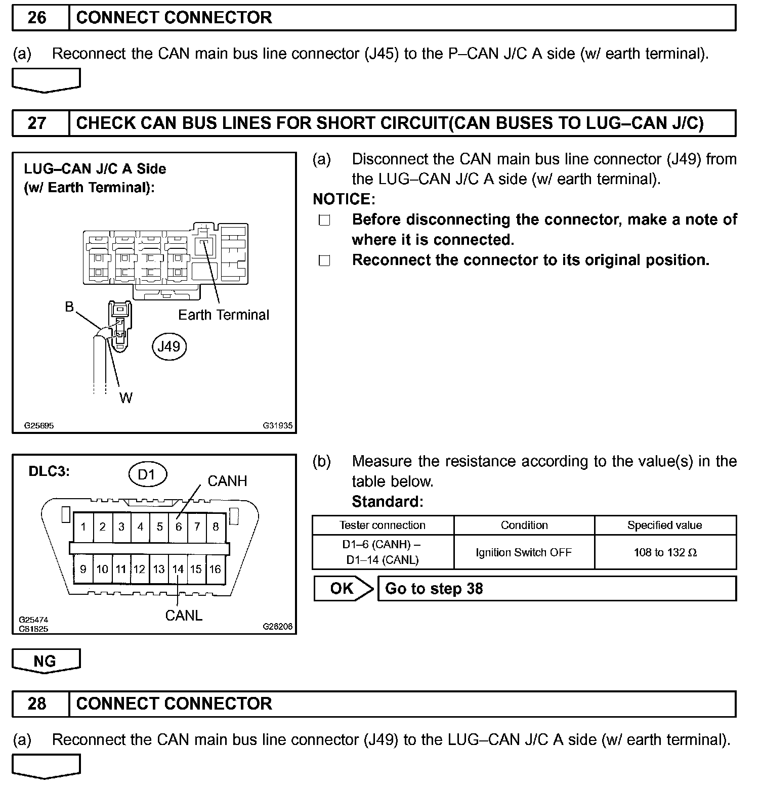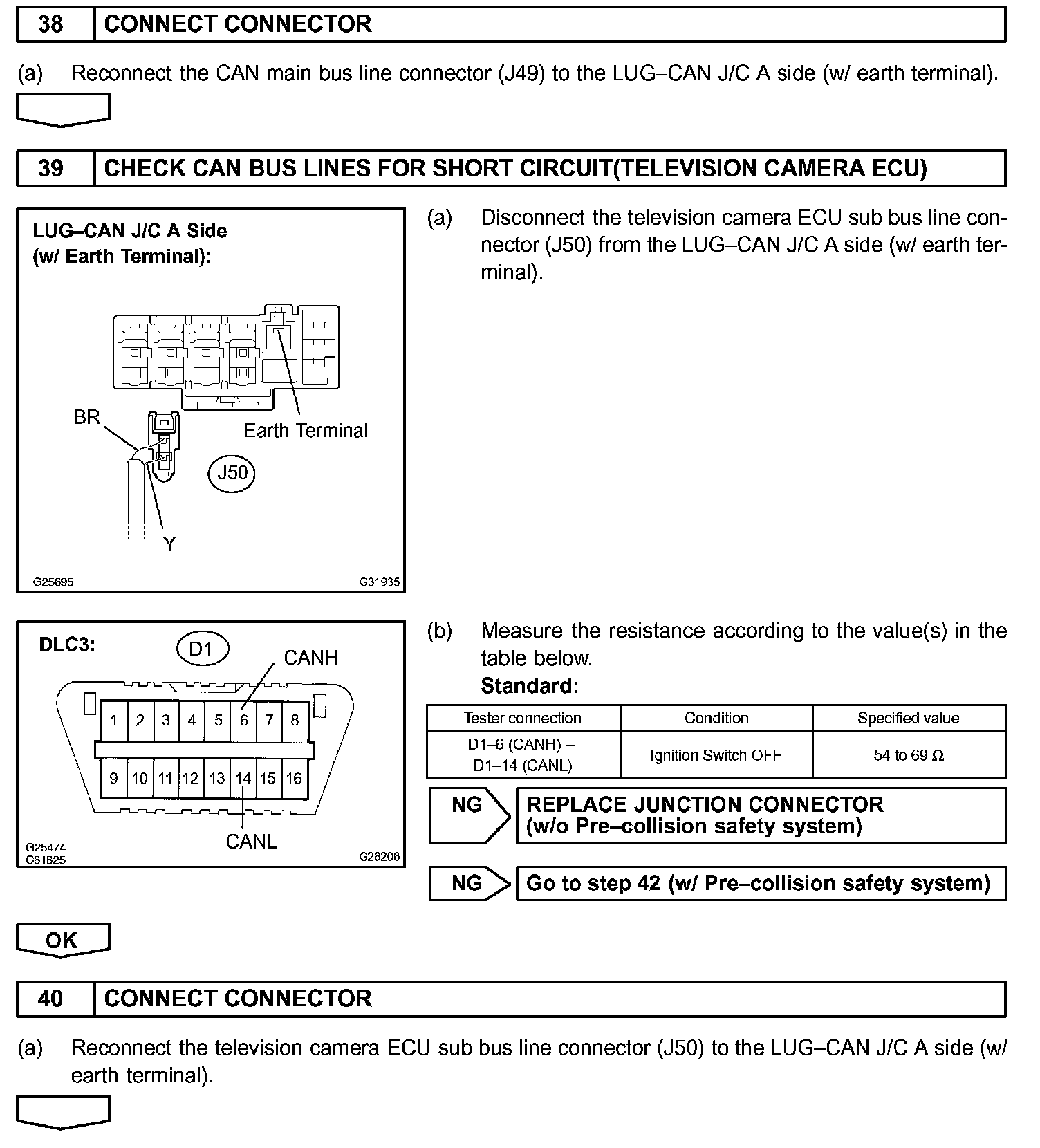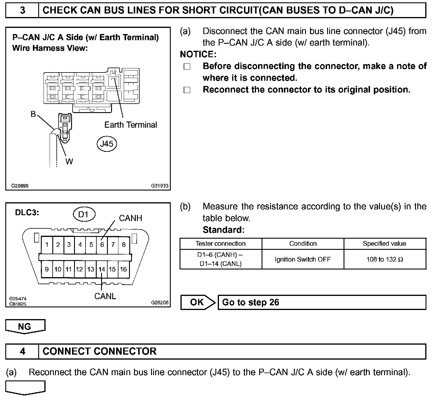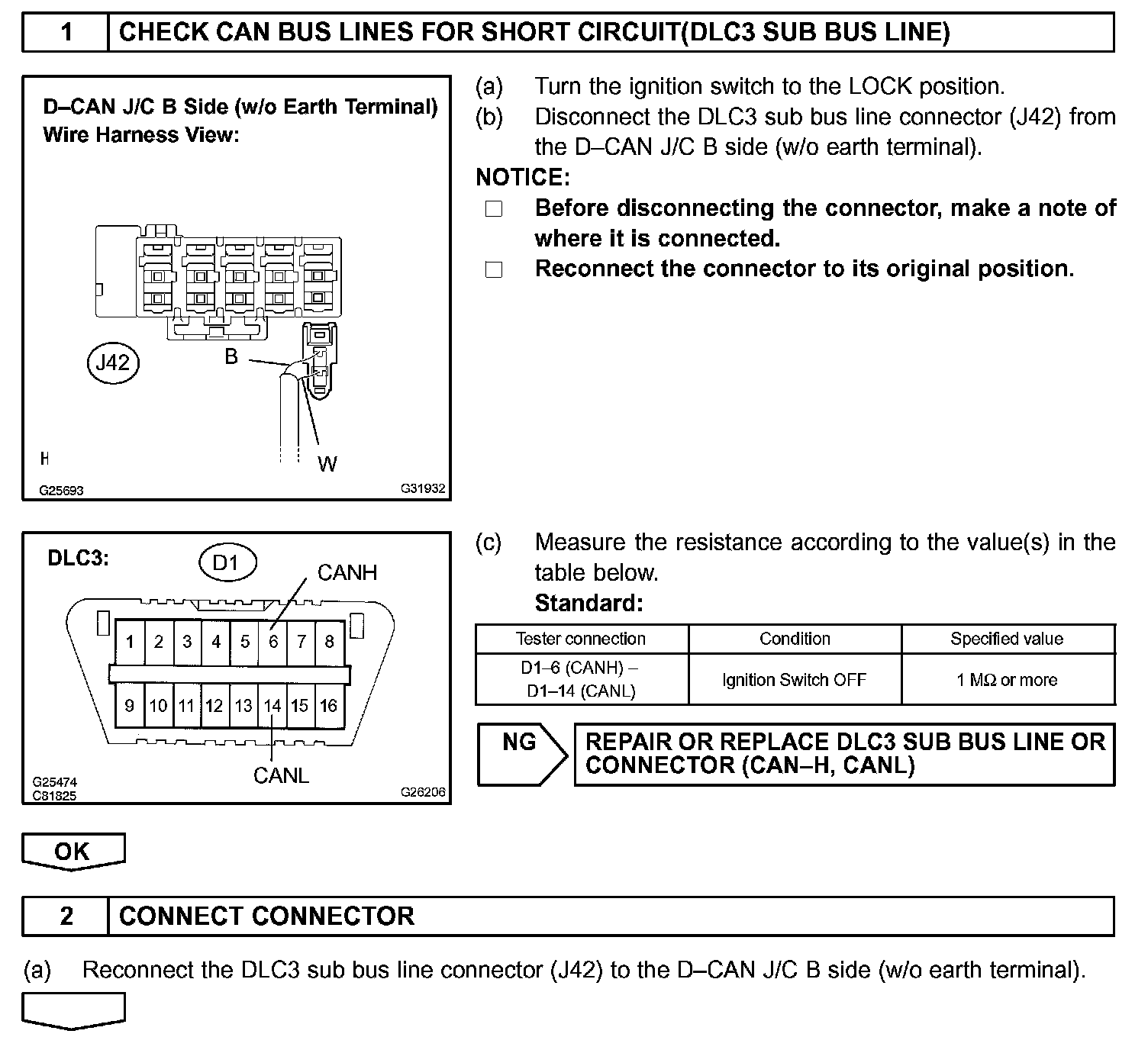 There may be a short circuit between the CAN bus lines when the resistance between terminals 6 (CANH) and 14 (CANL) of the DLC3 is below 54 Ohm.
