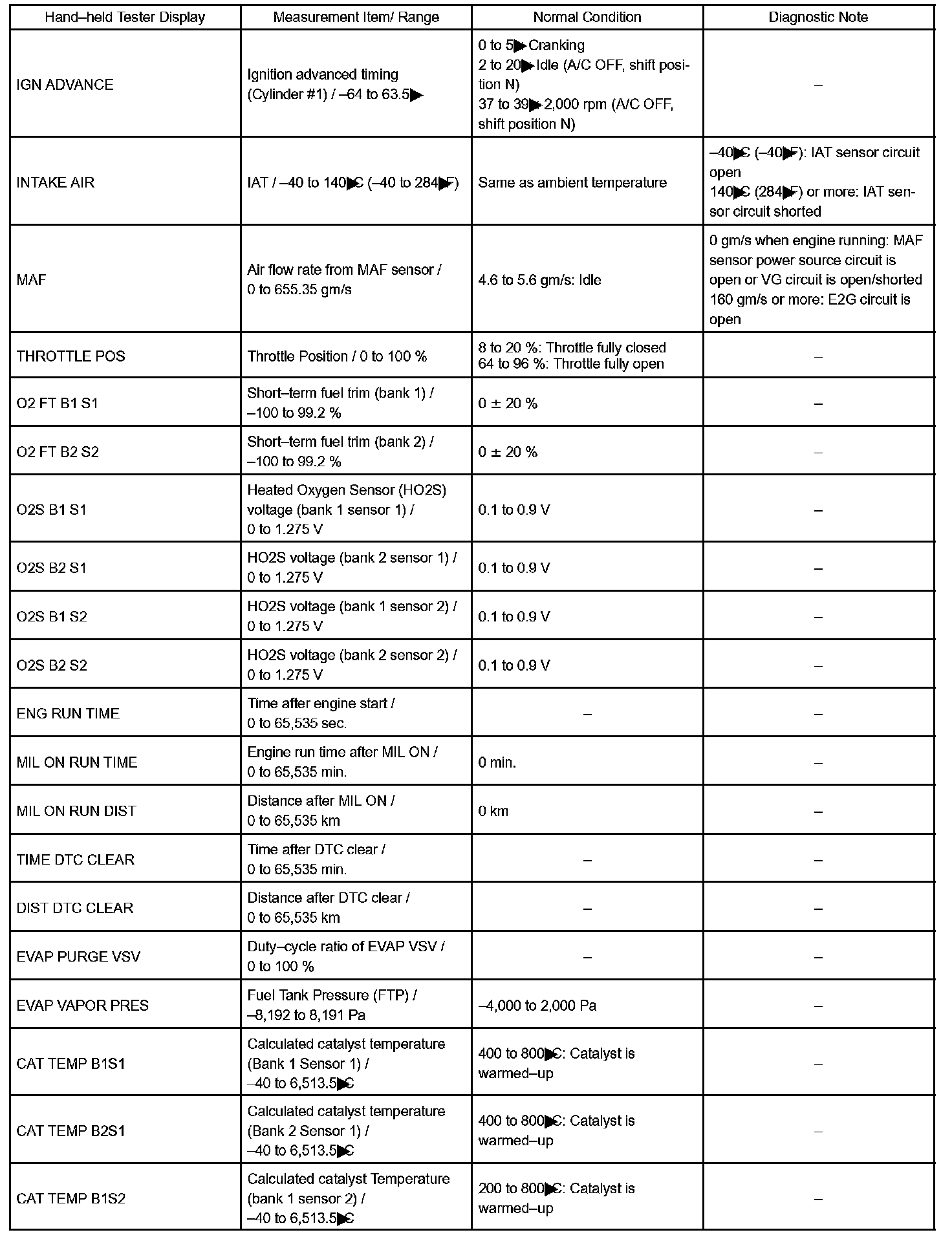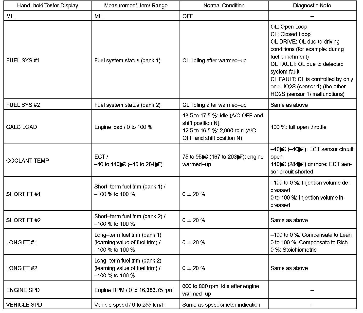 DATA LISTHINT: Using the hand-held tester's DATA LIST allows switch, sensor, actuator and other item values to be read without removing any parts. Reading the DATA LIST early in troubleshooting is one way to save time.