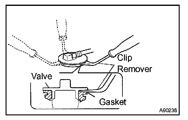 a. Insert a clip remover between the check valve and gasket, and remove the check valve pulling up the valve little by little.