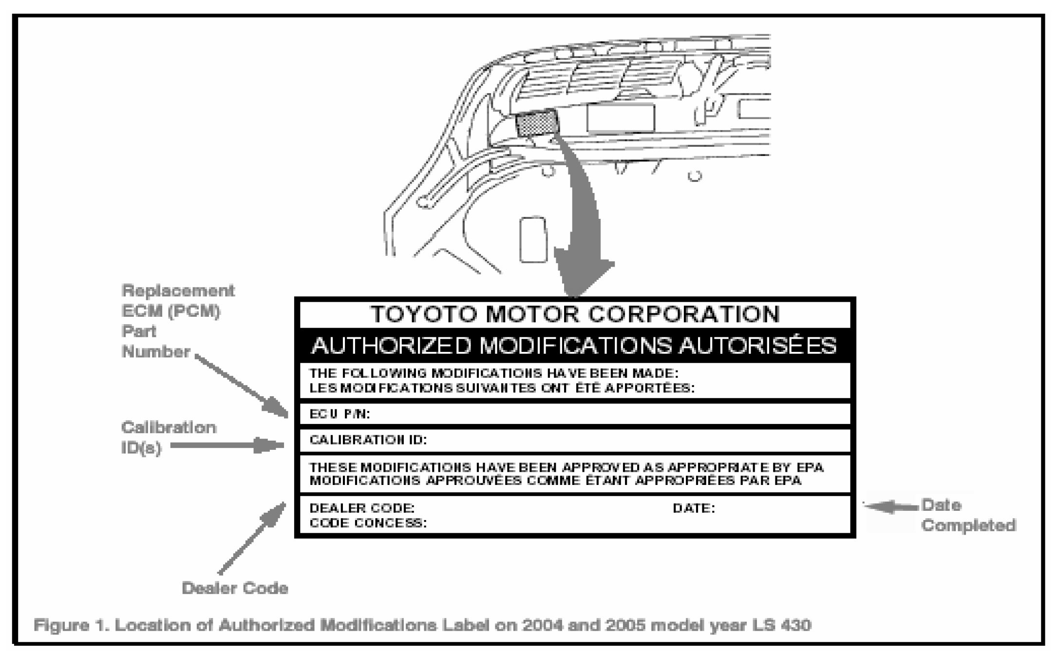 1. Check for the Authorized Modification Label affixed to the vehicle in the location shown in Figure 1. Confirm that the ECM (PCM) calibration has been updated. If not the latest ECM (PCM) calibration-go to step 2.