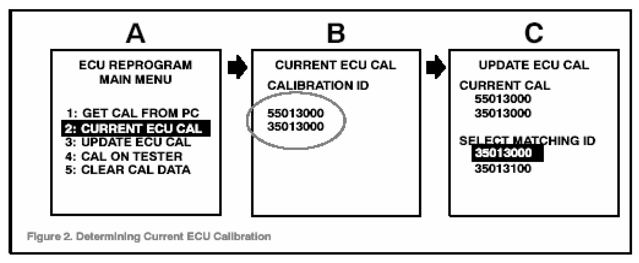 2. Connect the Diagnostic Tester to the vehicle and select "CURRENT ECU CAL" from the "ECU REPROGRAM MAIN MENU." Determine the vehicle's current ECU calibration (see Figure 2).