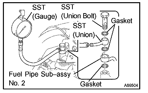 d. Install the fuel pipe sub-assembly No. 2 and SST (pressure gauge) to the delivery pipe with the 3 lower gaskets and SST (union bolt).
