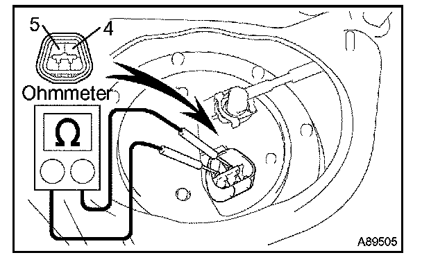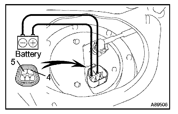 Connect the battery's positive (+) lead to terminal 4 of the connector, and the negative (-) lead to terminal 5. Check that the fuel pump operates.