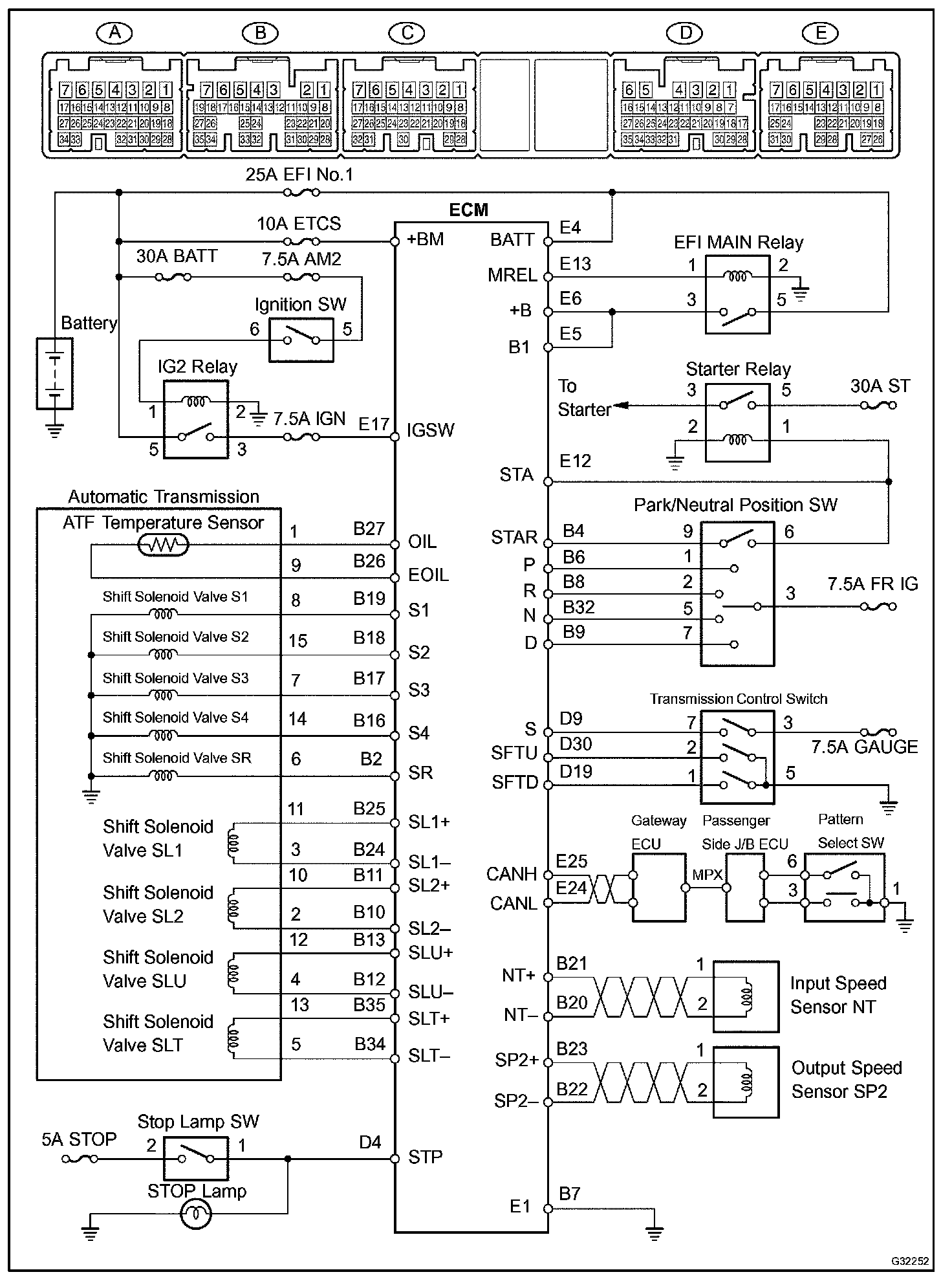 The engine control module adjusts the line hydraulic pressure to the optimal level by controlling TERMINAL SLT+ of the module according to the engine torque data. This realizes the smooth gear shifting.