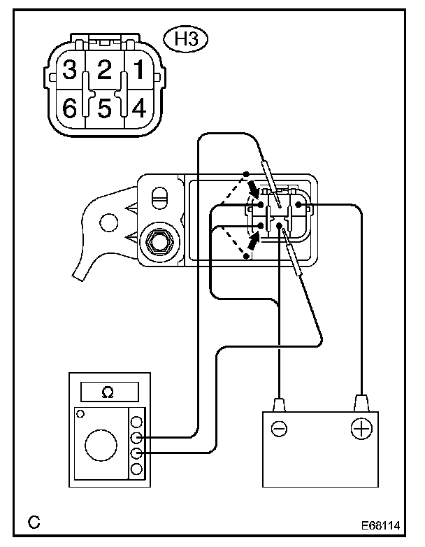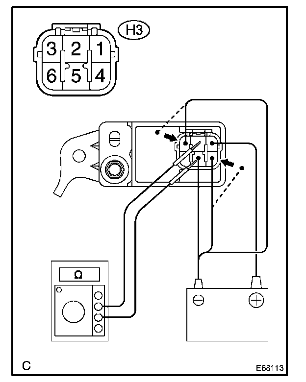5. Connect the negative (-) lead of the battery to terminals 3 and 6, and check that continuity exists between terminals 2 and 5 for 0.8 to 0.9 seconds. No continuity should then exist.