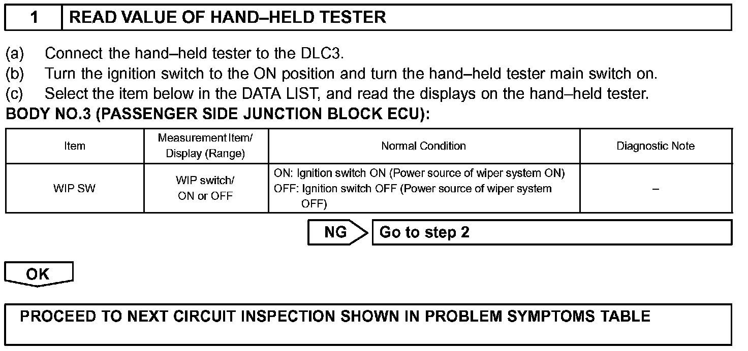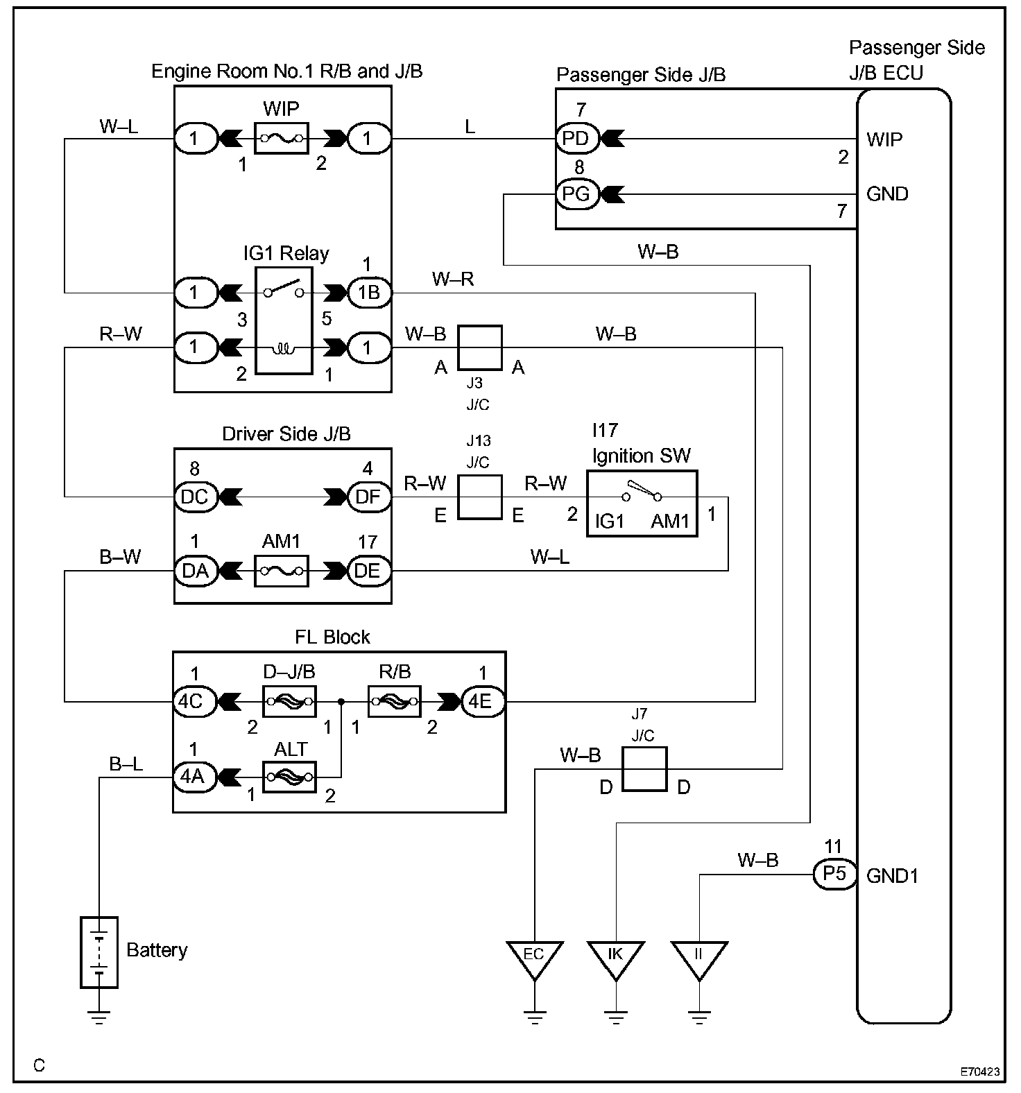 This circuit provides power to the front wiper motor and operates the passenger side junction block ECU.