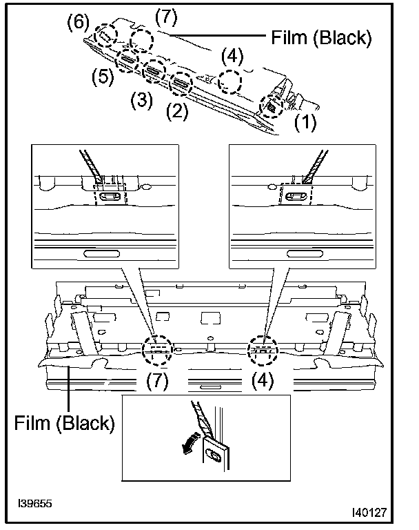 (b) Using a thin Flathead screwdriver with the tip taped up with protective tape, disengage the 7 claw fittings in the order shown in the illustration.