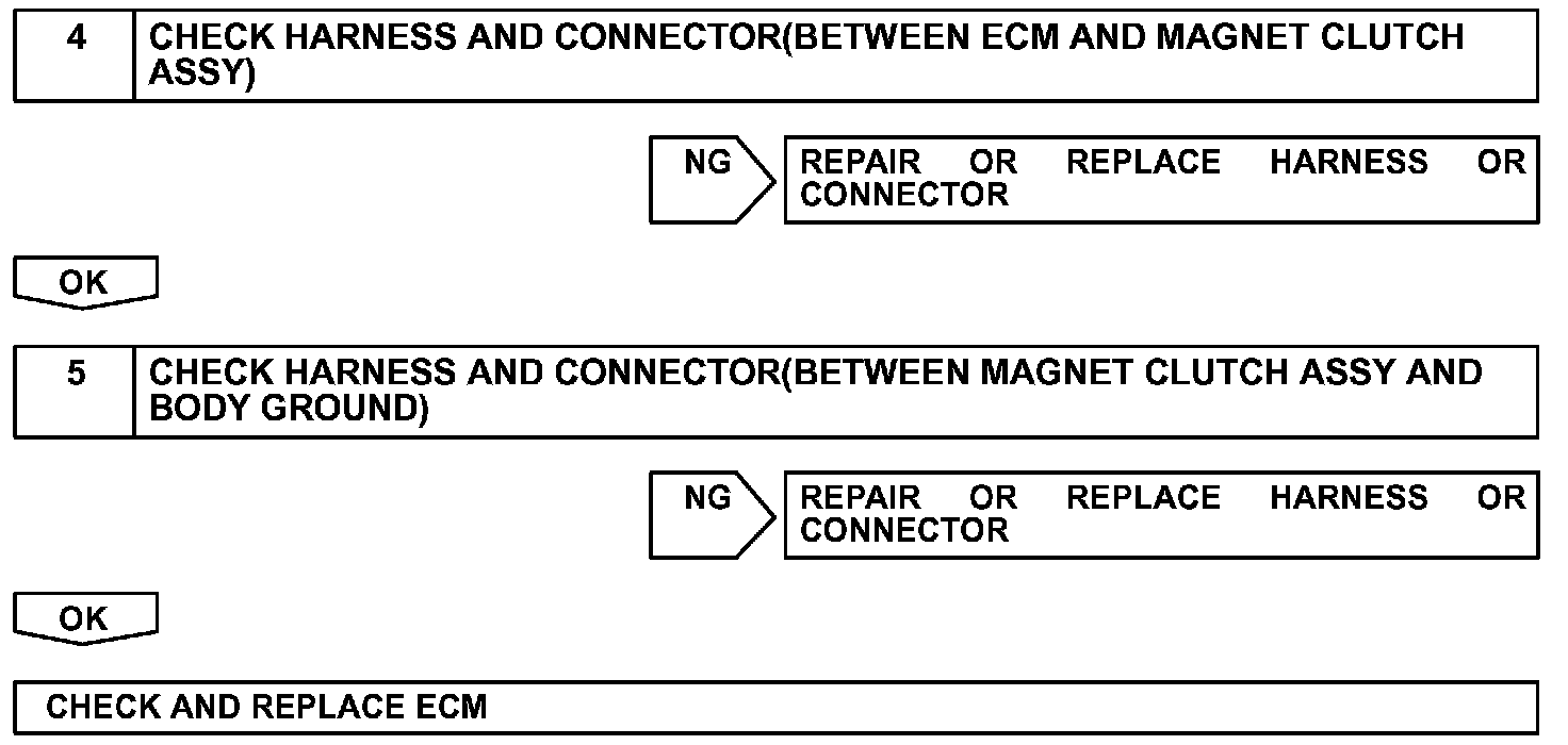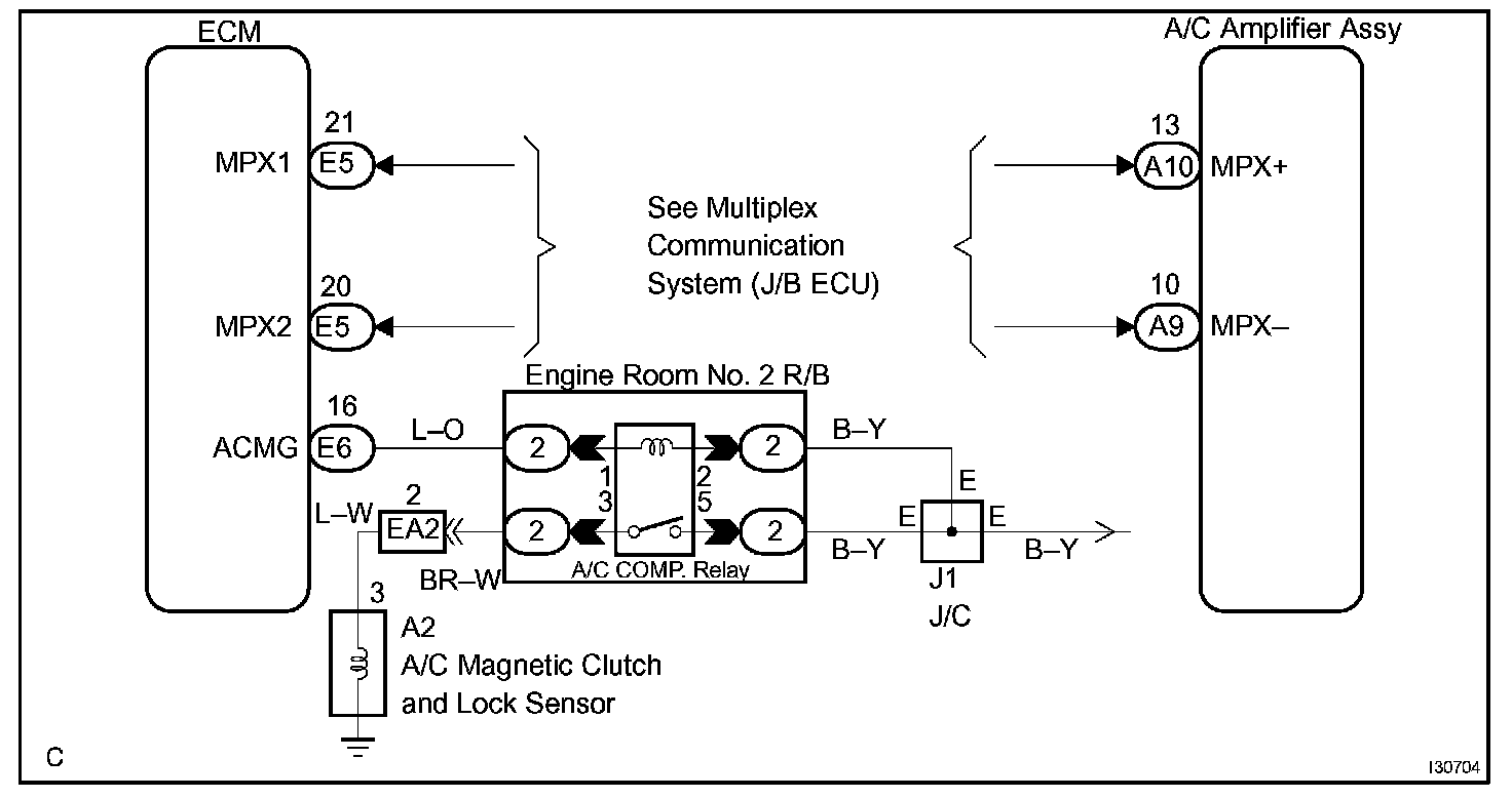 The air conditioning amplifier outputs the magnetic clutch ON signal from terminal MPX to the ECM receives this signal, it sends a signal from terminal ACMG and switches the magnetic clutch relay ON, thus turning on the magnetic clutch.