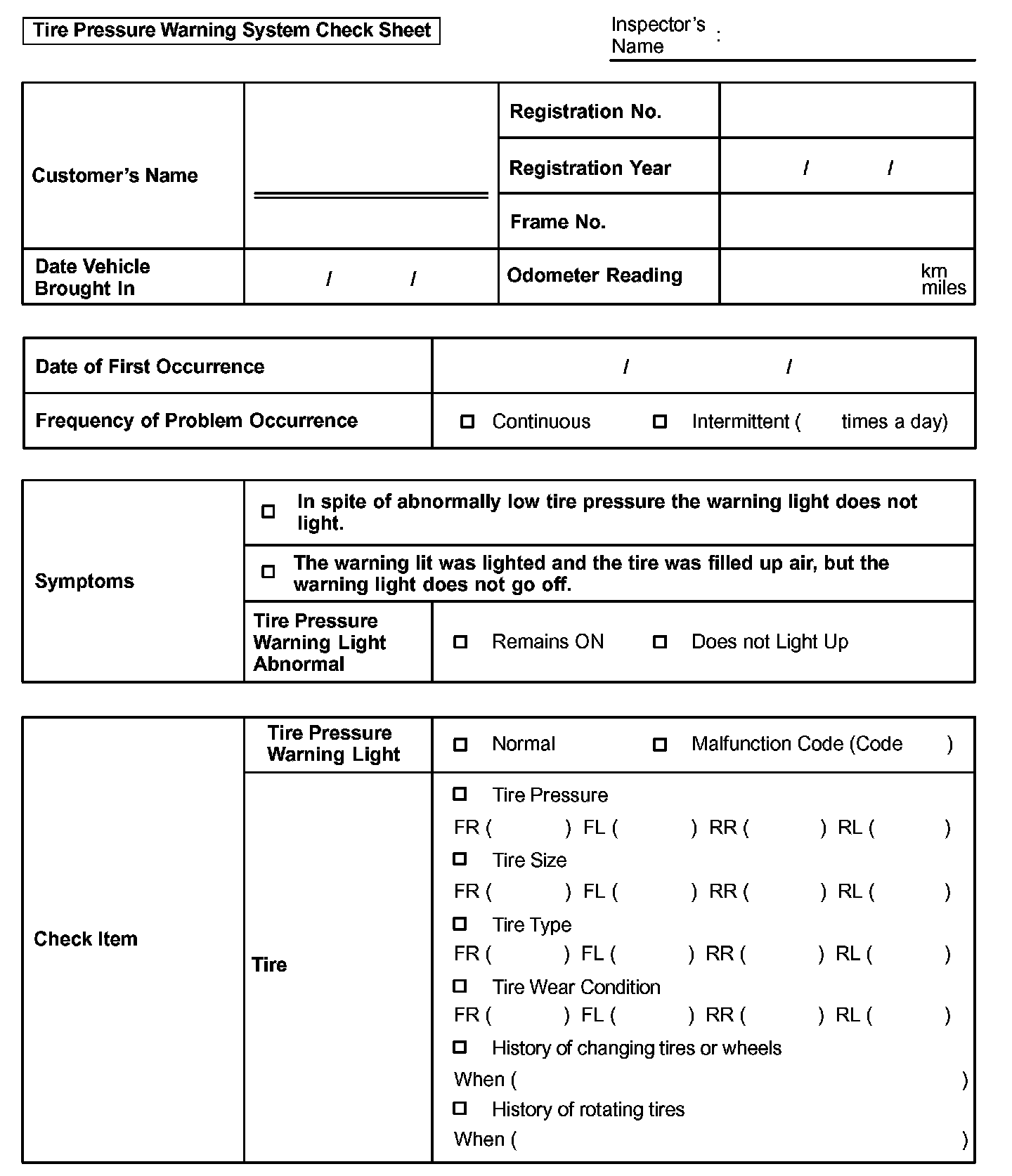 Tire Pressure Warning System Check Sheet: