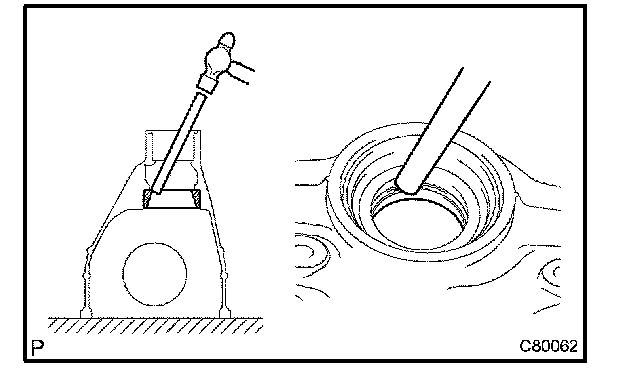 HINT: Set the dial indicator to the rearmost position (upper side in the illustration) of the area around where the side oil seal tapped in.