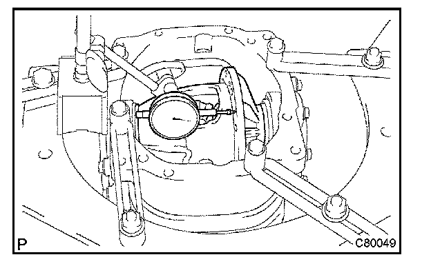 (b) Set a dial indicator to the end of the differential ring gear face.