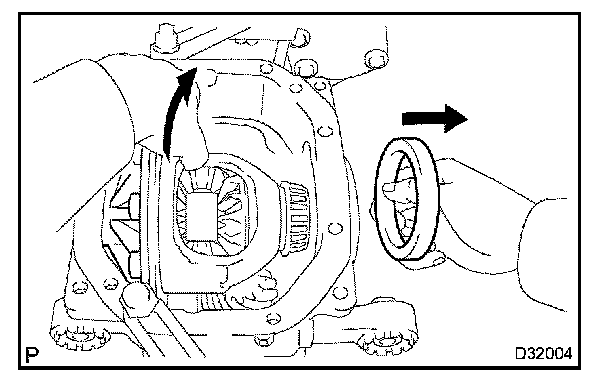 (a) Raise the ring gear side of the differential case slightly to remove the drive pinion side outer race.