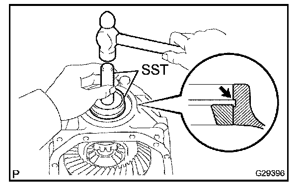 (d) Using SST and a hammer, install the ring gear side outer race.