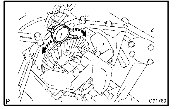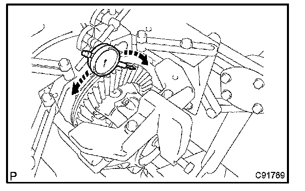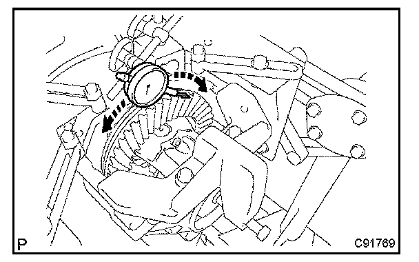 (c) While holding the rear drive pinion companion flange rear, rotate the differential ring gear and measure the backlash.