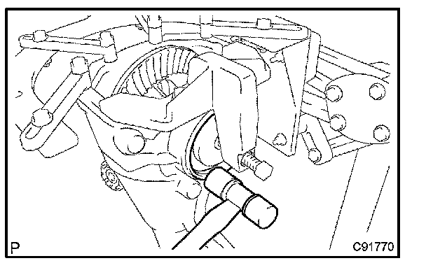 (j) Using a plastic hammer, lightly tap the drive pinion side of the differential carrier.
