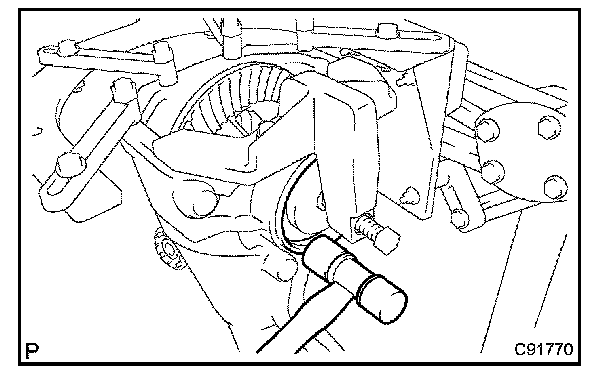 (h) Using SST and a hammer, create a clearance between the side gear shaft shaft snap ring on the ring gear side and outer race.