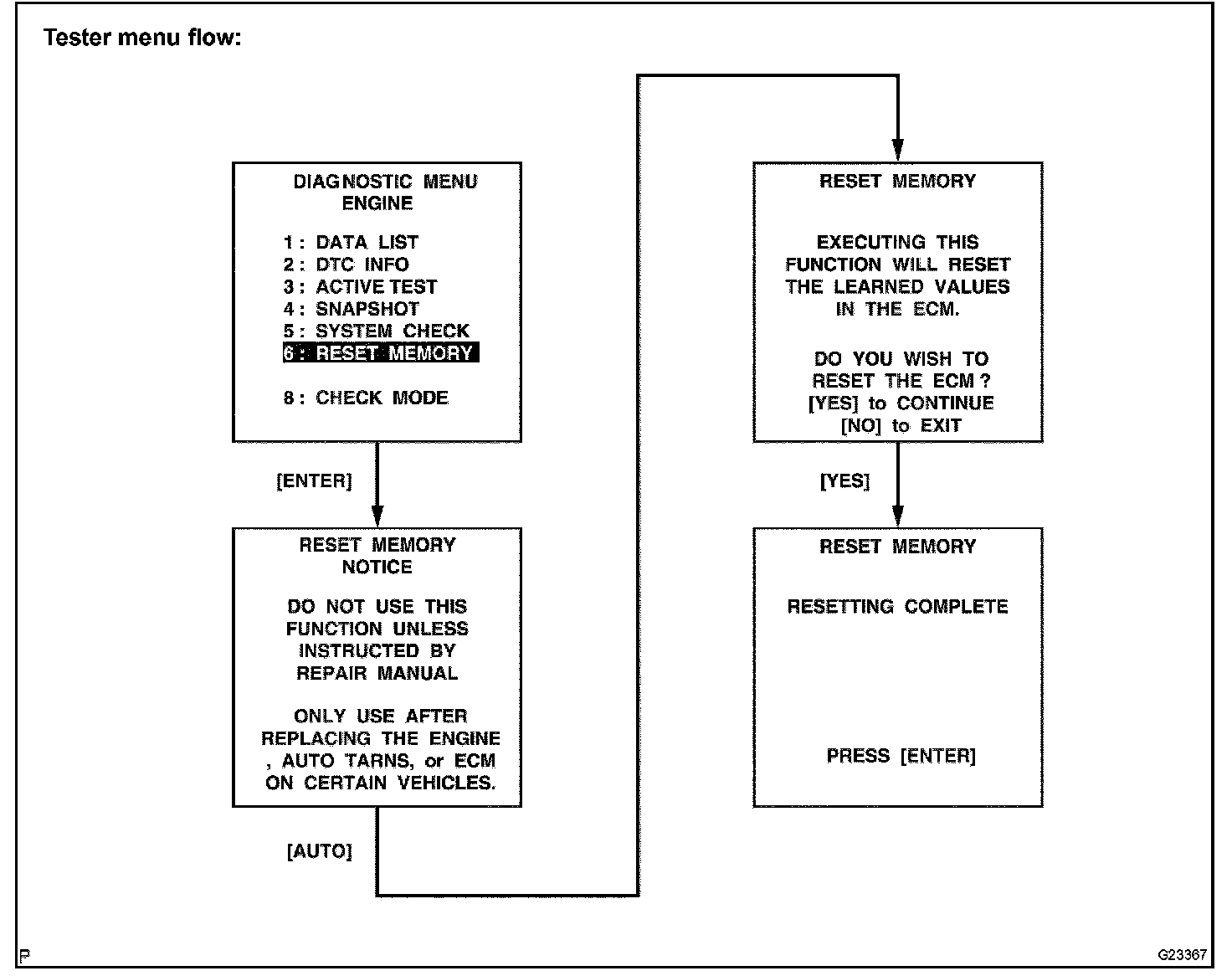 CAUTION: Perform the RESET MEMORY (AT initialization) when replacing the automatic transnission assy, engine assy or ECM.