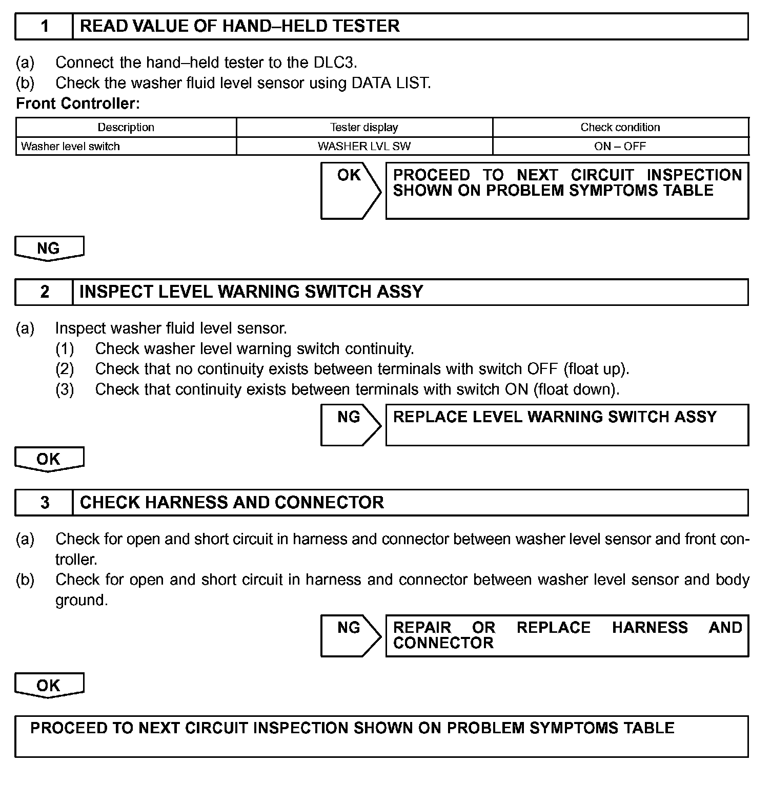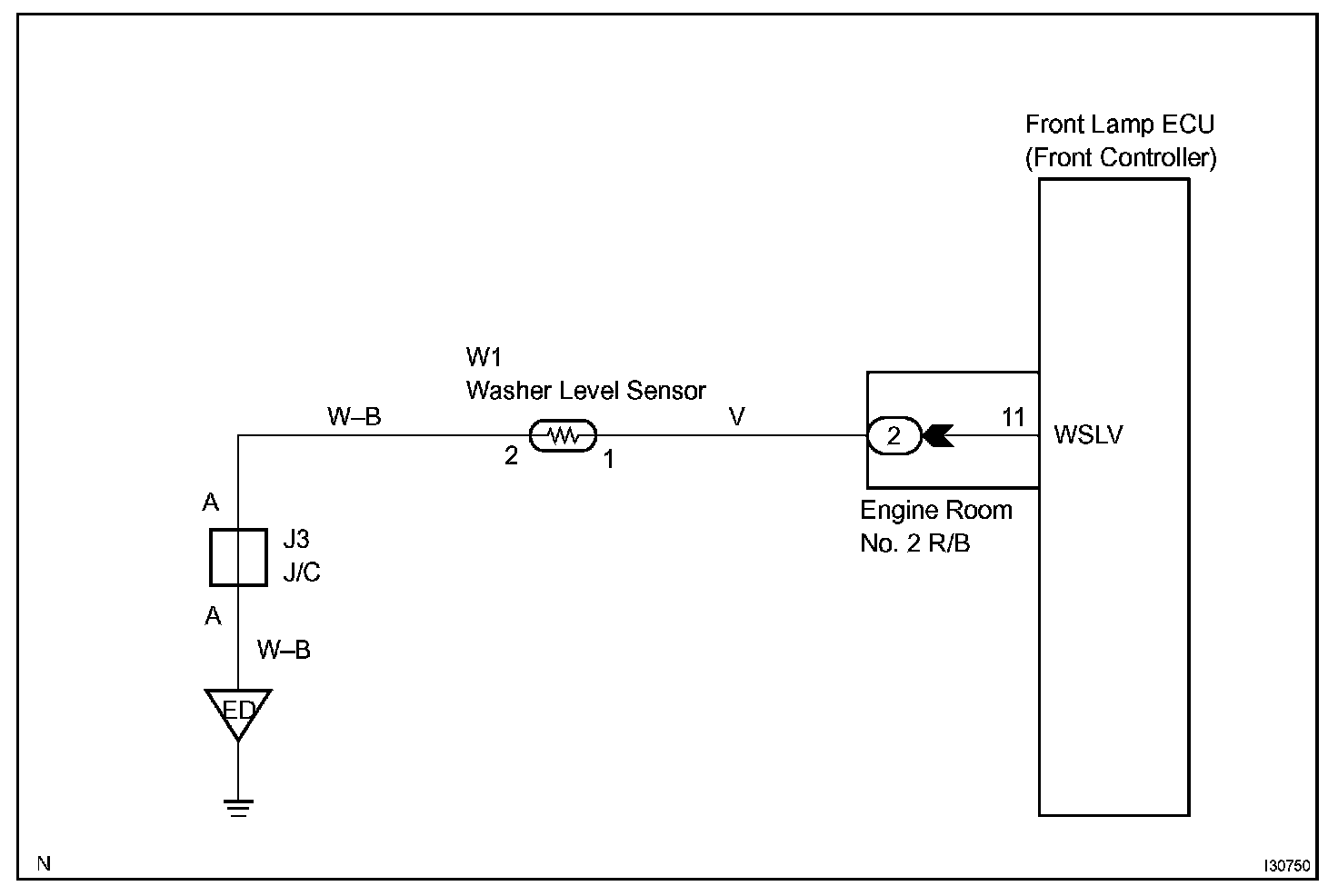 Front lamp ECU receives washer fluid level sensor information, and sends it through the multiplex commu nication circuit to the combination meter.