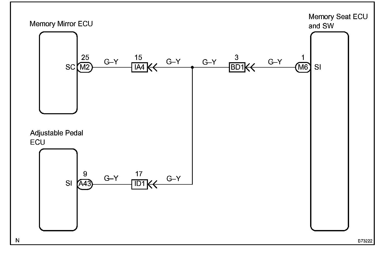The power seat control system controls the storing and restoring of the adjustable pedal and power mirror position. During this operation, the store/restore operation signals are sent/received using serial communication.