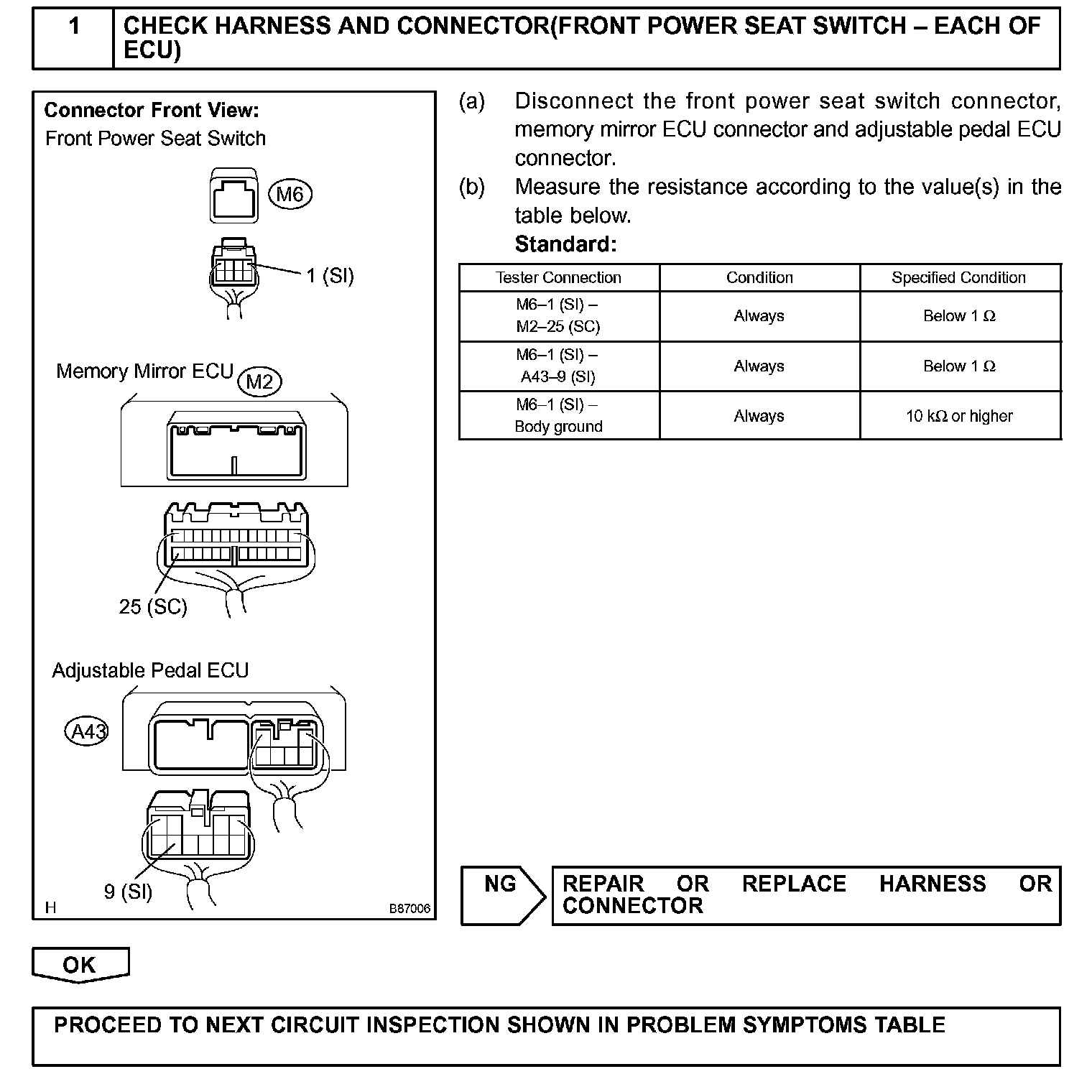 - The adjustable pedal restore signal is not received for 2 seconds while power seat control is operating.