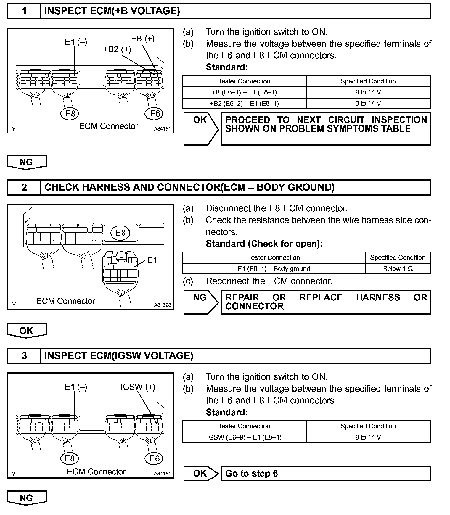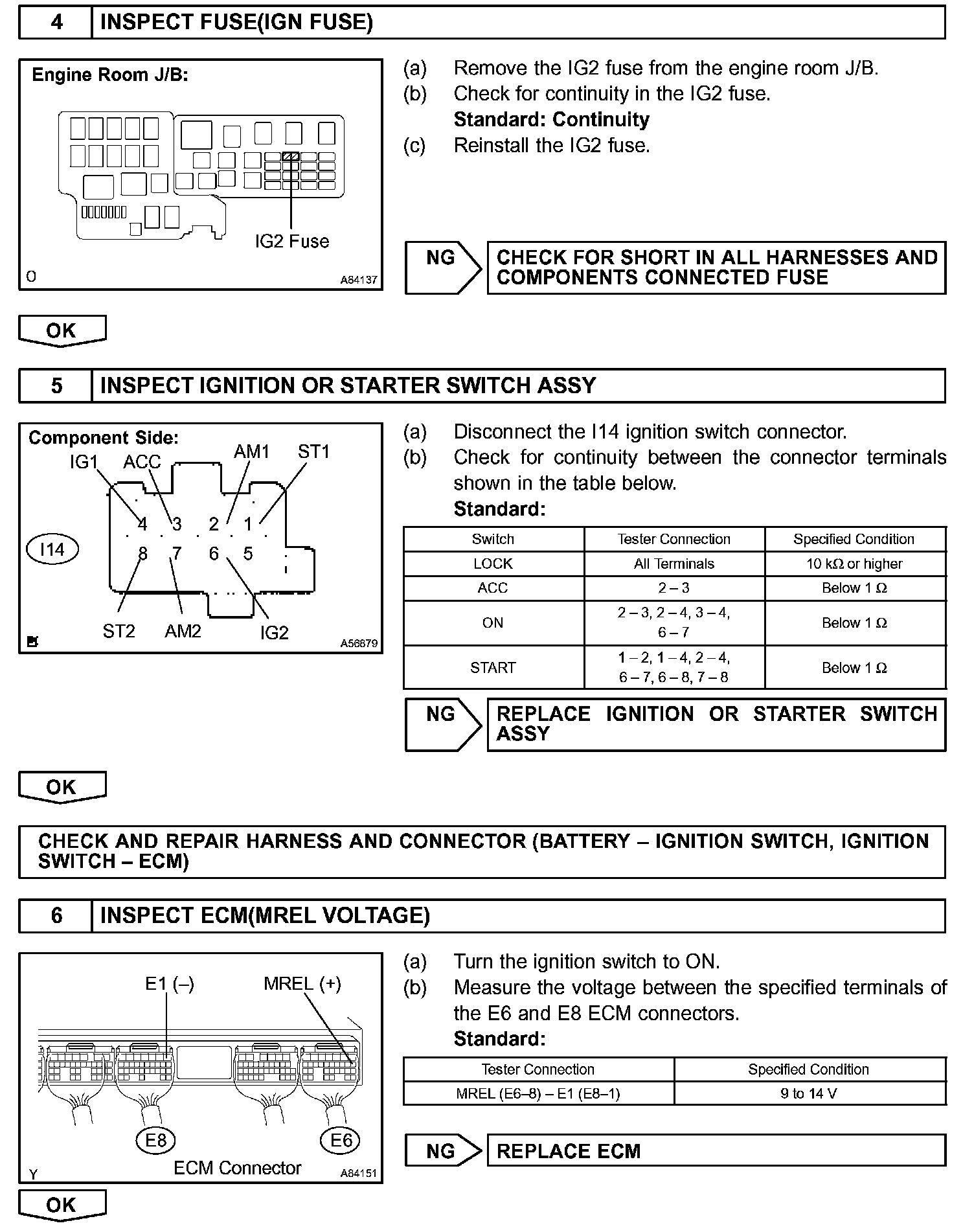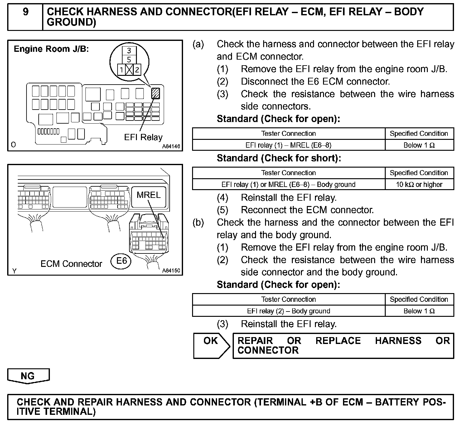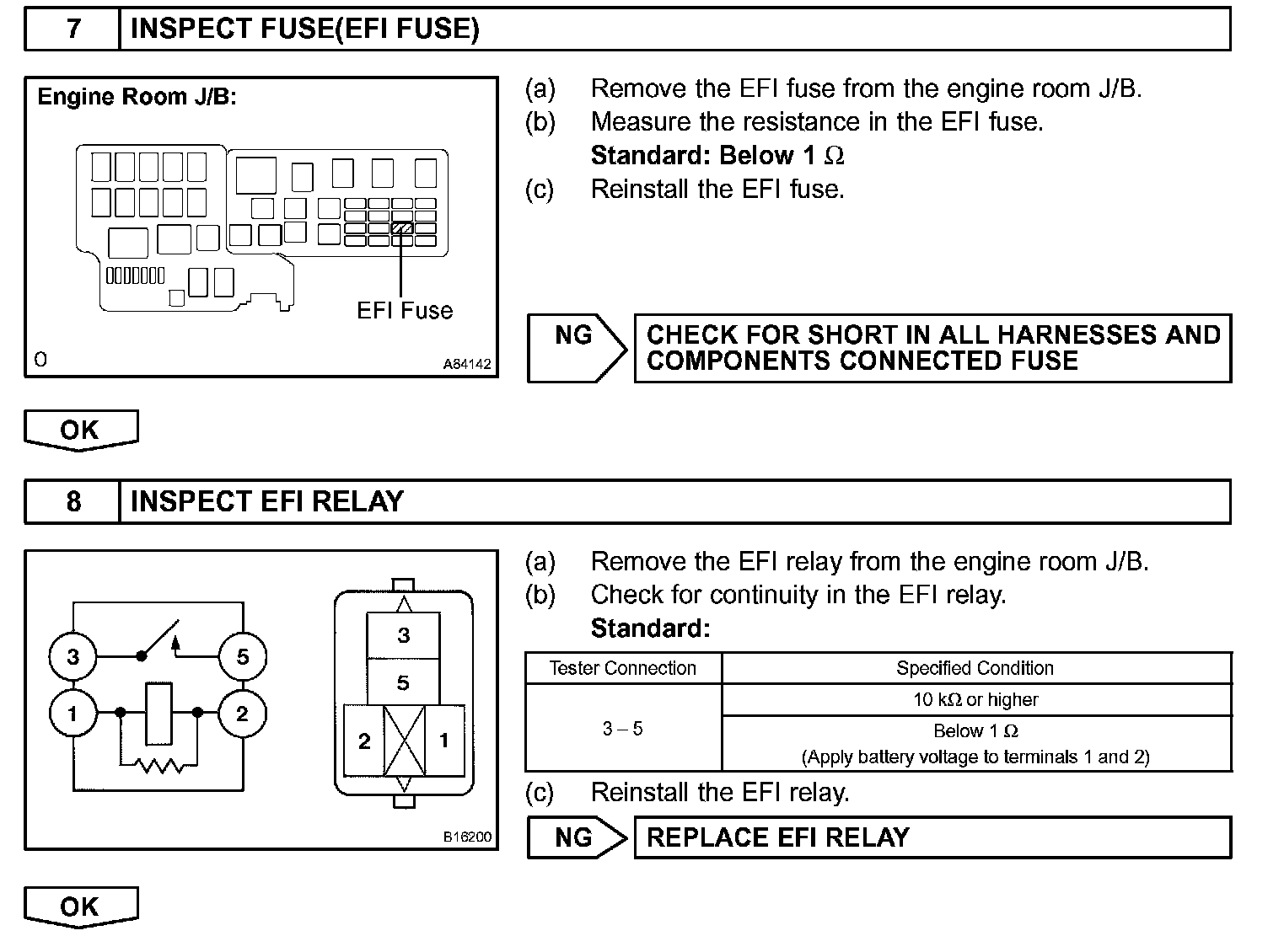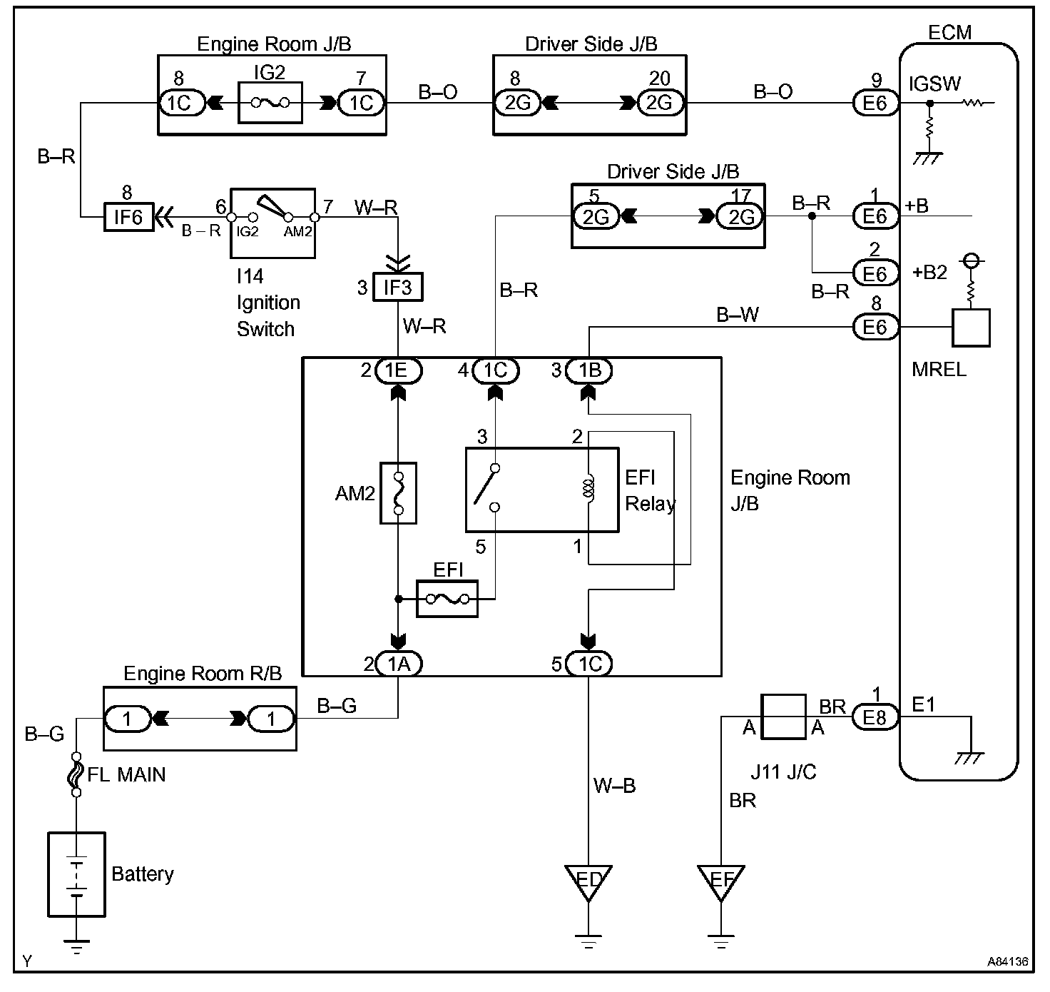 When the ignition switch is turned to ON, battery voltage is applied to terminal IGSW of the ECM. The ECM "MREL" output signal causes current to flow to the coil, closing the contacts of the EFI relay and supplying power to terminal +B of the ECM. If the ignition switch is turned to OFF, the ECM holds the EFI relay ON for a maximum of 2 seconds to allow for the initial setting of the throttle valve.