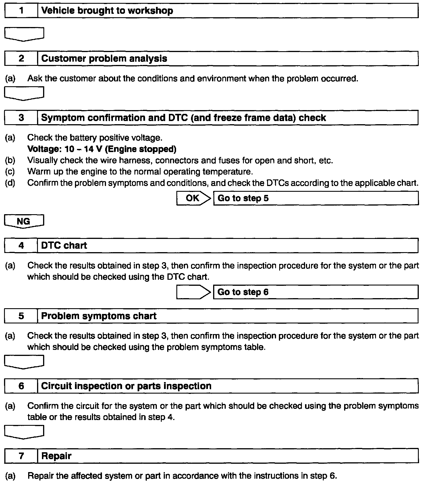 HOW TO PROCEED WITH TROUBLESHOOTINGHINT: Carry out a troubleshooting in accordance with the procedure given. Here, only the basic procedure is shown. Details are provided in the applicable diagnostics section, showing the most effective methods for each circuit. Confirm the troubleshooting procedures first for the relevant circuit before beginning the troubleshooting of that circuit.